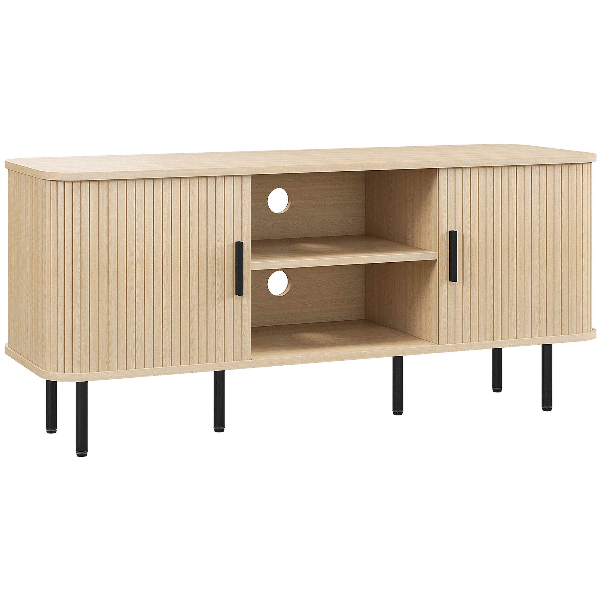 • O estilo moderno de meados do século deste móvel para televisão com portas em ripas confere um toque decorativo único Com duas prateleiras e dois armários que proporcionam um amplo espaço de arrumação Com orifício para cabos para uma gestão oculta dos cabos, para manter a área limpa e sem emaranhados A base elevada facilita a limpeza por baixo e mantém os artigos afastados de pisos húmidos As almofadas de proteção nas pernas evitam danos no chão A superfície laminada desta mobília de sala de estar garante durabilidade e limpeza fácil Requer montagem