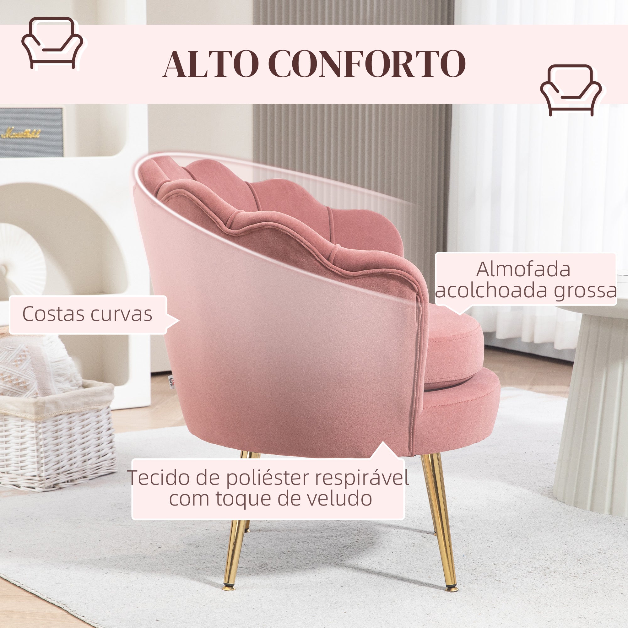 - ERGONOMIA E CONFORTO: Esta pequena poltrona para quarto foi desenhada a pensar no seu conforto. Tanto o assento como o encosto estão completamente acolchoados com espuma, proporcionando um conforto inigualável. O seu revestimento de veludo rosa é suave ao toque e fácil de manter, garantindo uma experiência de descanso agradável