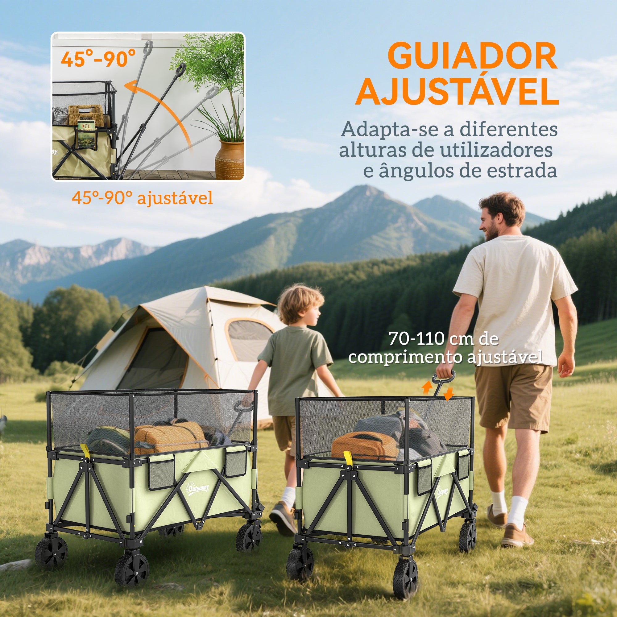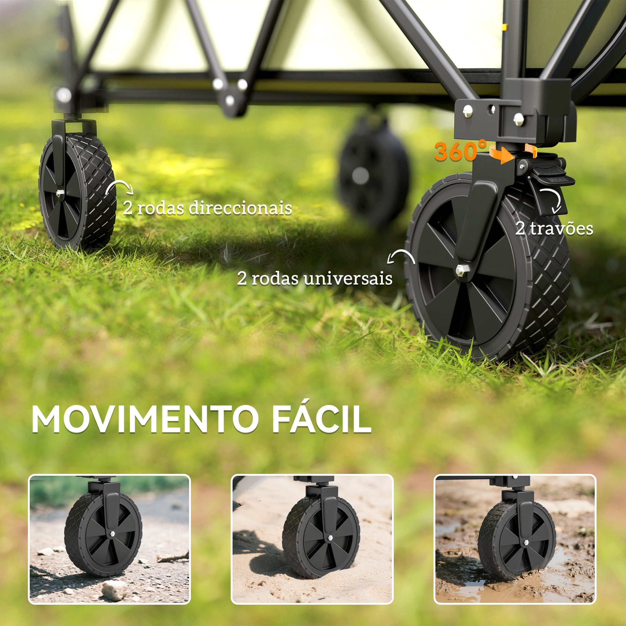 Carrinho de Transporte Dobrável 180 L Carrinho de Jardim com Comprimento e Ângulo do Guiador Ajustáveis e Paredes Laterais Extensíveis Carga 120 kg para Pátio Praia Cáqui