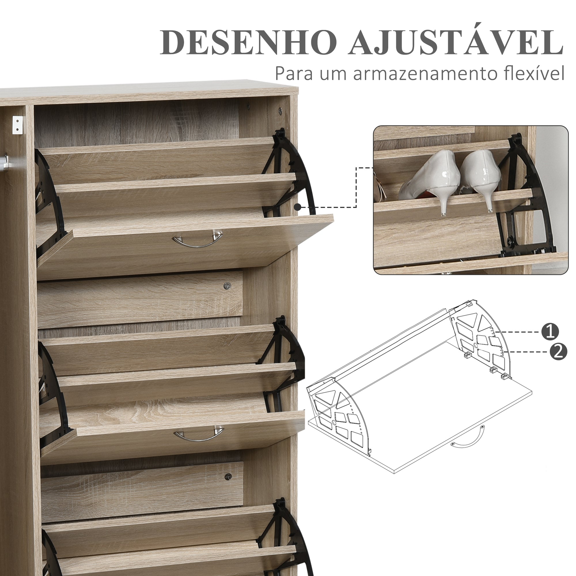 • 3 compartimentos com portas dobráveis, cada um com uma prateleira divisória que dobra o espaço interior para armazenar até 12 pares no total