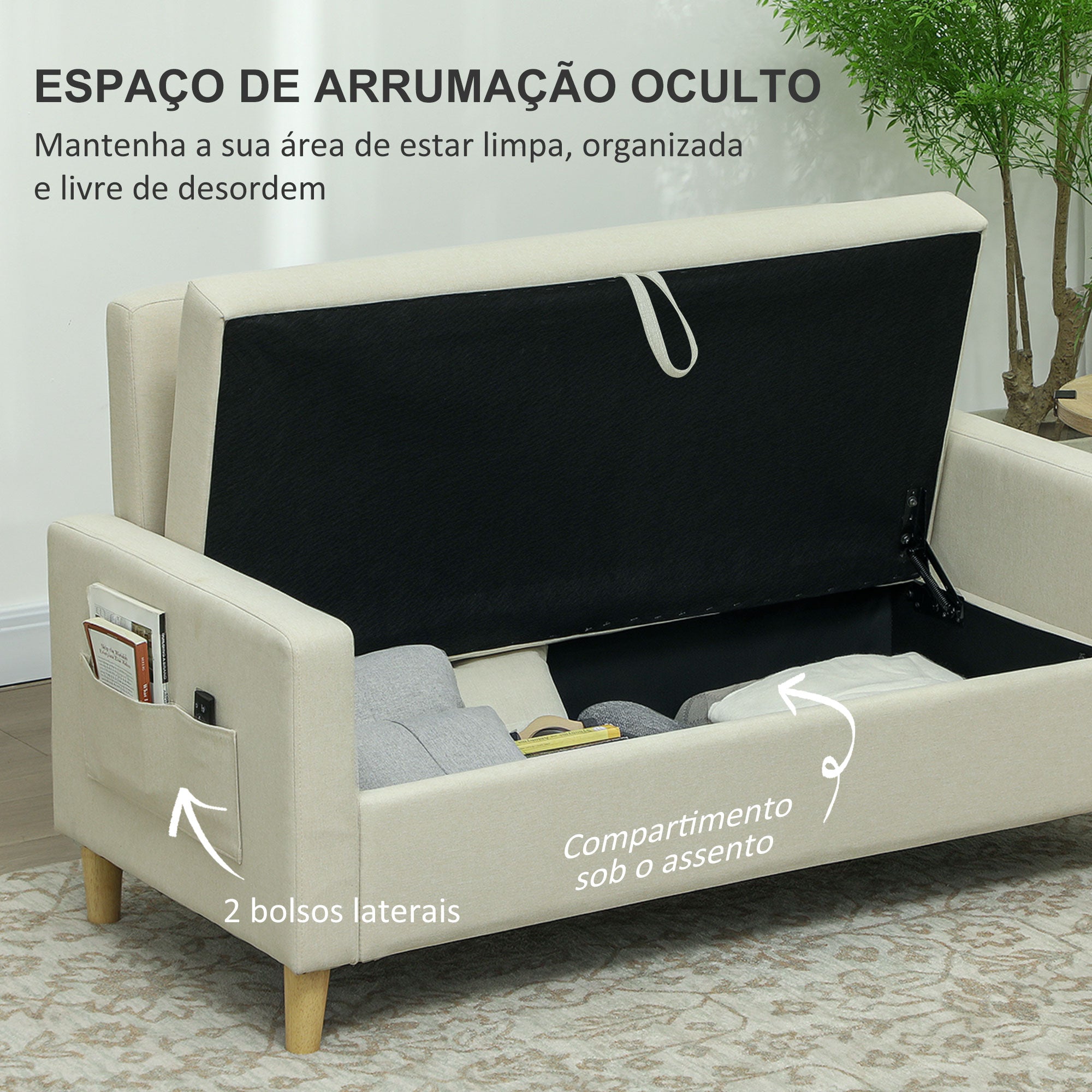 • ESPAÇO DE ARRUMAÇÃO: Este sofá de dois lugares inclui um compartimento por baixo do assento e bolsos laterais, ideais para guardar cobertores, almofadas, revistas ou comandos, ajudando a manter a sua sala de estar organizada e sem desordem
