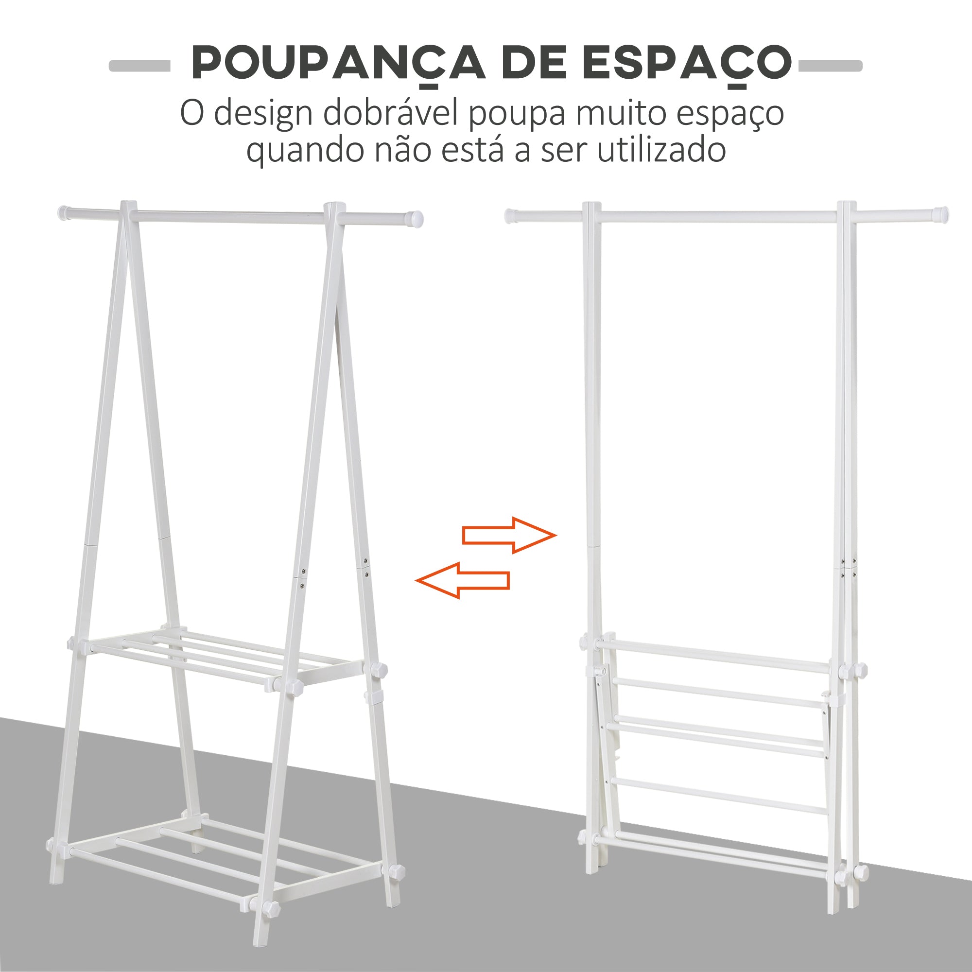 - MEDIDAS TOTAIS: 107,5x45x150 cm (CxLxA). Medidas dobrado: 107,5x9x151 cm (CxLxA). Peso máximo suportado: 40 kg (total), 20 kg (barra de pendurar), 10 kg (cada prateleira). Fácil de montar Mantenha as suas roupas perfeitamente organizadas com este suporte para cabide da HOMCOM. A sua estrutura de aço com revestimento em pó proporciona uma base resistente, e o seu desenho em forma de 'A' garante um equilíbrio ótimo, mesmo quando está completamente carregado. Equipado com dois estantes de ripas na parte inferior, oferece espaço adicional para armazenar sapatos, bolsas e caixas, enquanto o seu acabamento em branco adiciona um toque de elegância a qualquer espaço