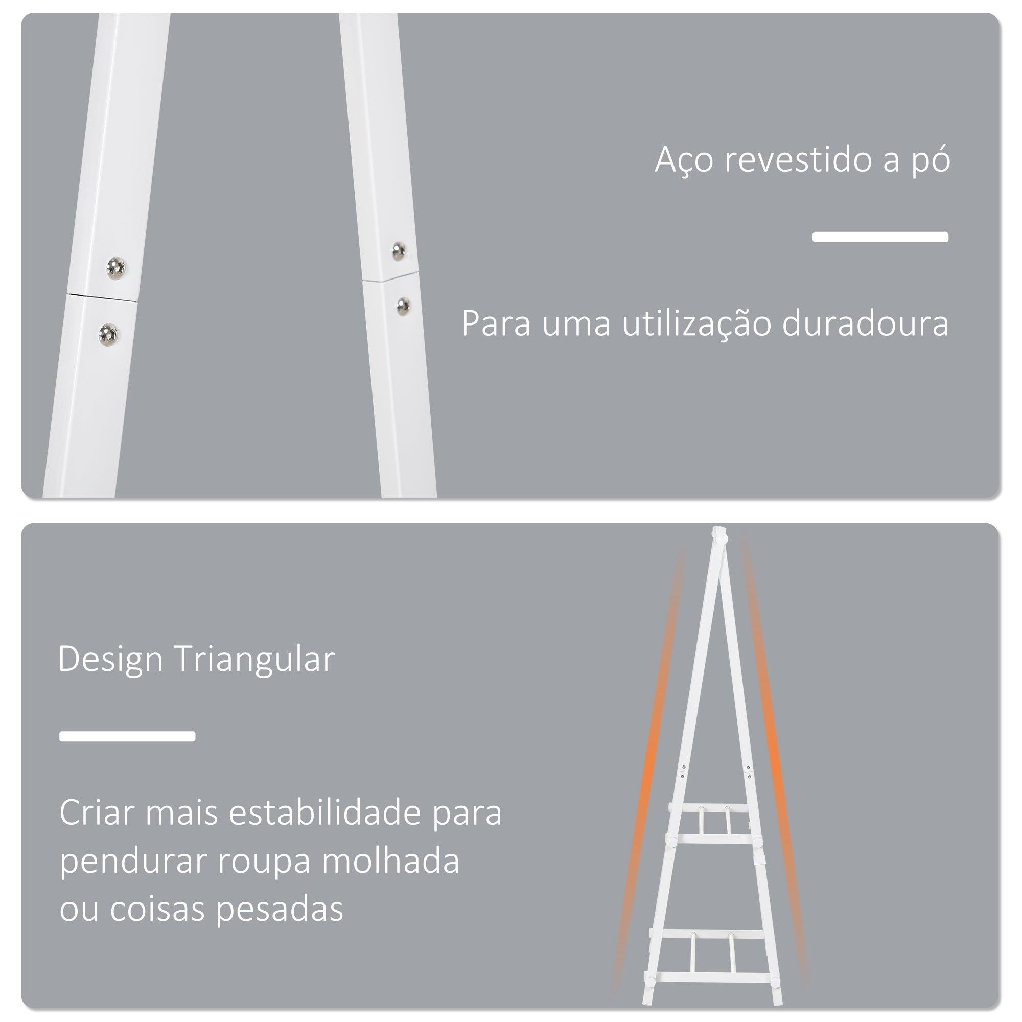 - ESTRUTURA DE AÇO: O cabide é construído com uma estrutura de aço com revestimento em pó para garantir maior resistência e portabilidade. A estrutura em forma de 'A' proporciona um equilíbrio extra e estabilidade mesmo quando está completamente carregado