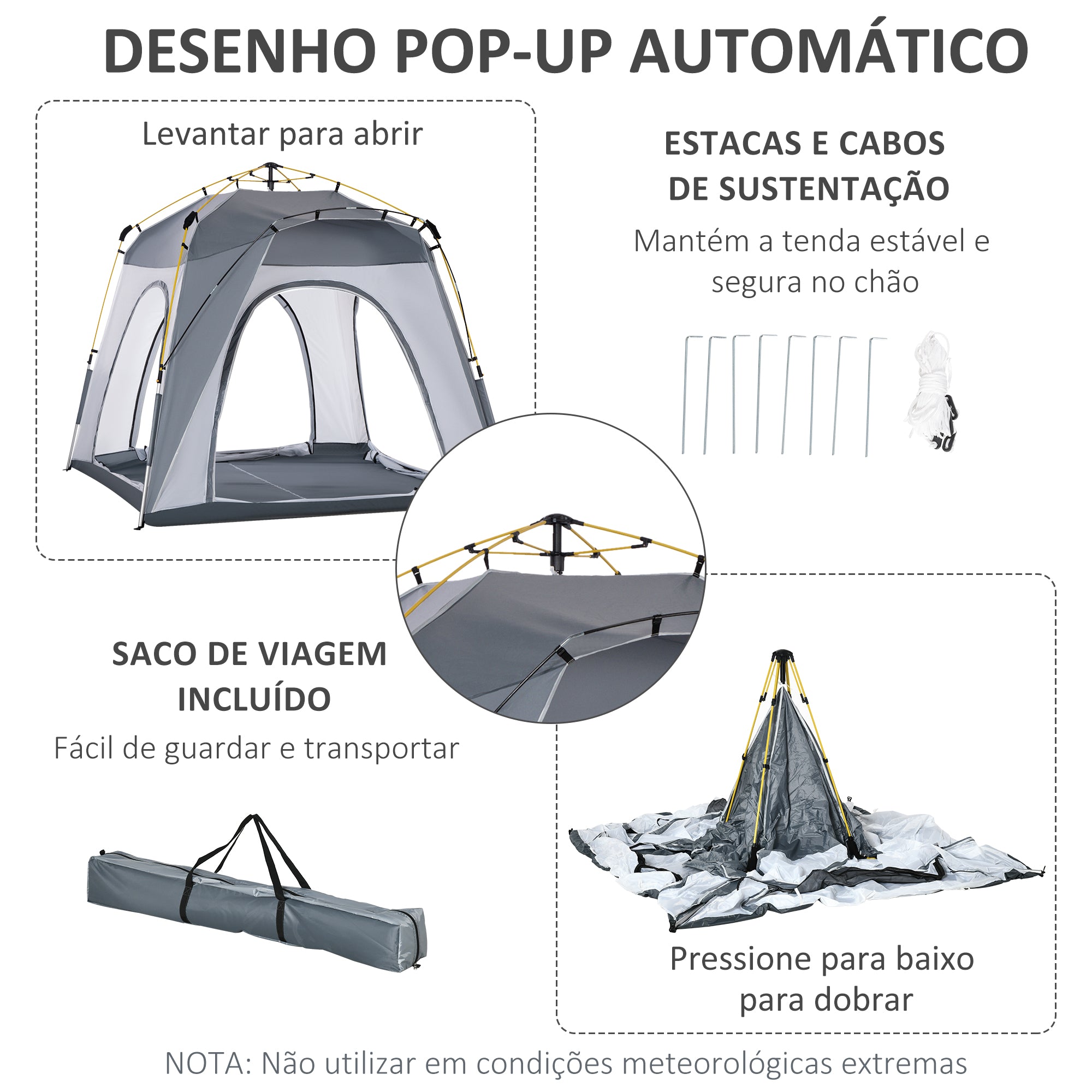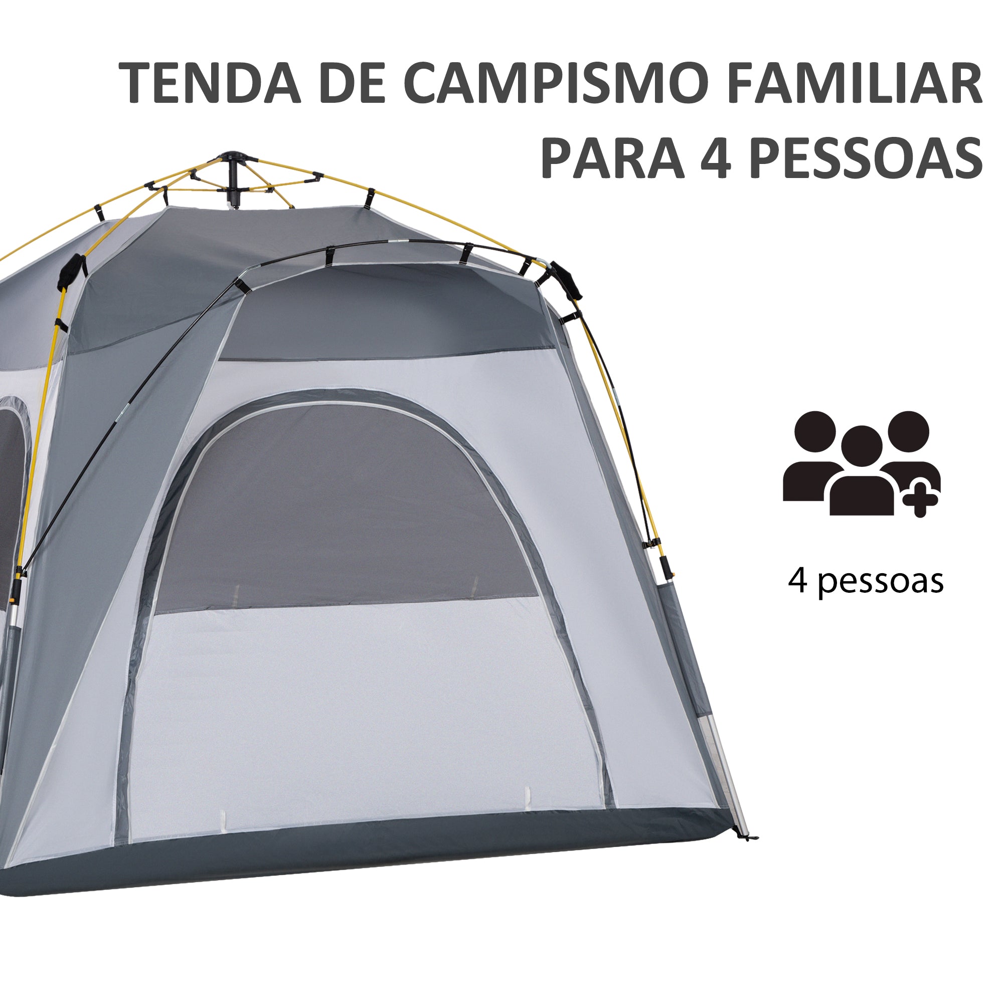 - Tenda de campismo pop up fácil de montar e desmontar Grande o suficiente para acomodar confortavelmente até 4 pessoas Fabricada com tecido de poliéster 190T, liga de alumínio, e fibras de vidro, resistentes e ideais para uma utilização prolongada Possui 4 portas com janelas para um fácil acesso e melhor ventilação 2 bolsos de armazenamento no interior ideais para pequenos objetos como telemóvel, chaves, entre outros Inclui 8 estacas de solo e 4 cordas de tensão para uma maior estabilidade e segurança Com bolsa de transporte para facilitar o armazenamento e transporte Requer uma fácil e rápida montagem NOTA: Esta tenda não é adequada para condições climáticas adversas, não utilize·a em caso de ventos, chuva ou neve