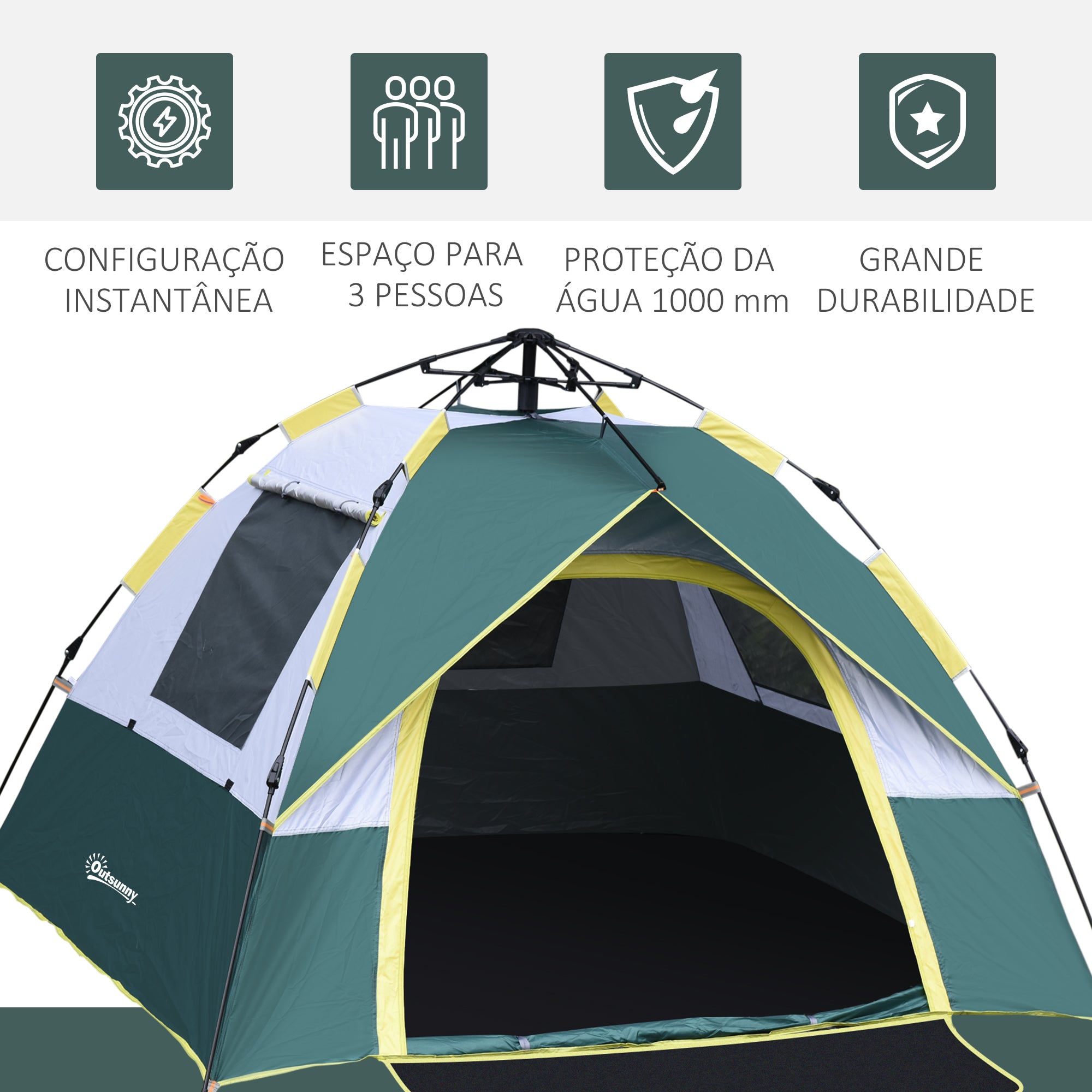 Tenda de Campismo para 3 Pessoas Tenda de Campismo Dobrável com 1 Porta 3 Janelas Bolsa de Transporte e Abertura Automática para Praia Parque 205x195x135 cm Verde
