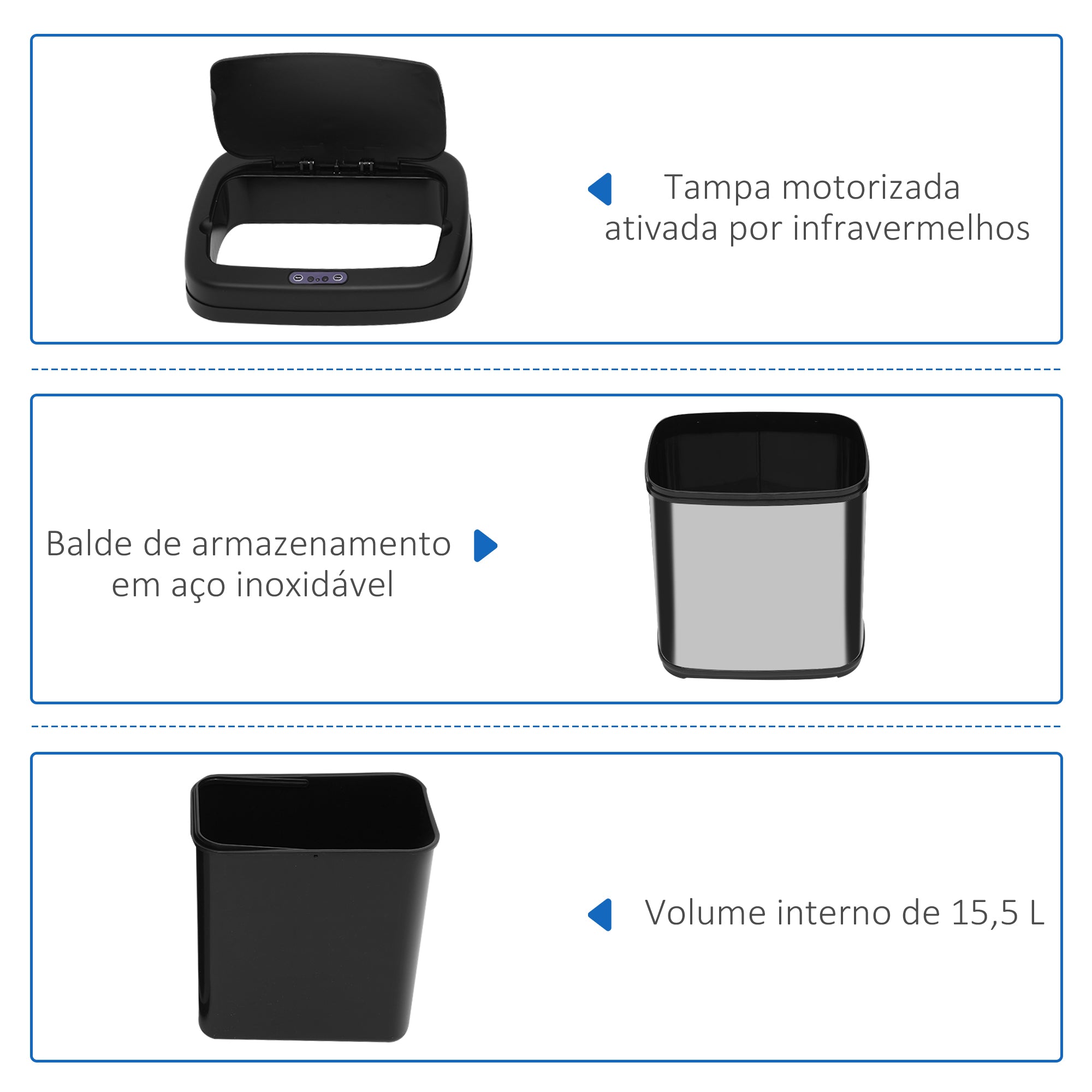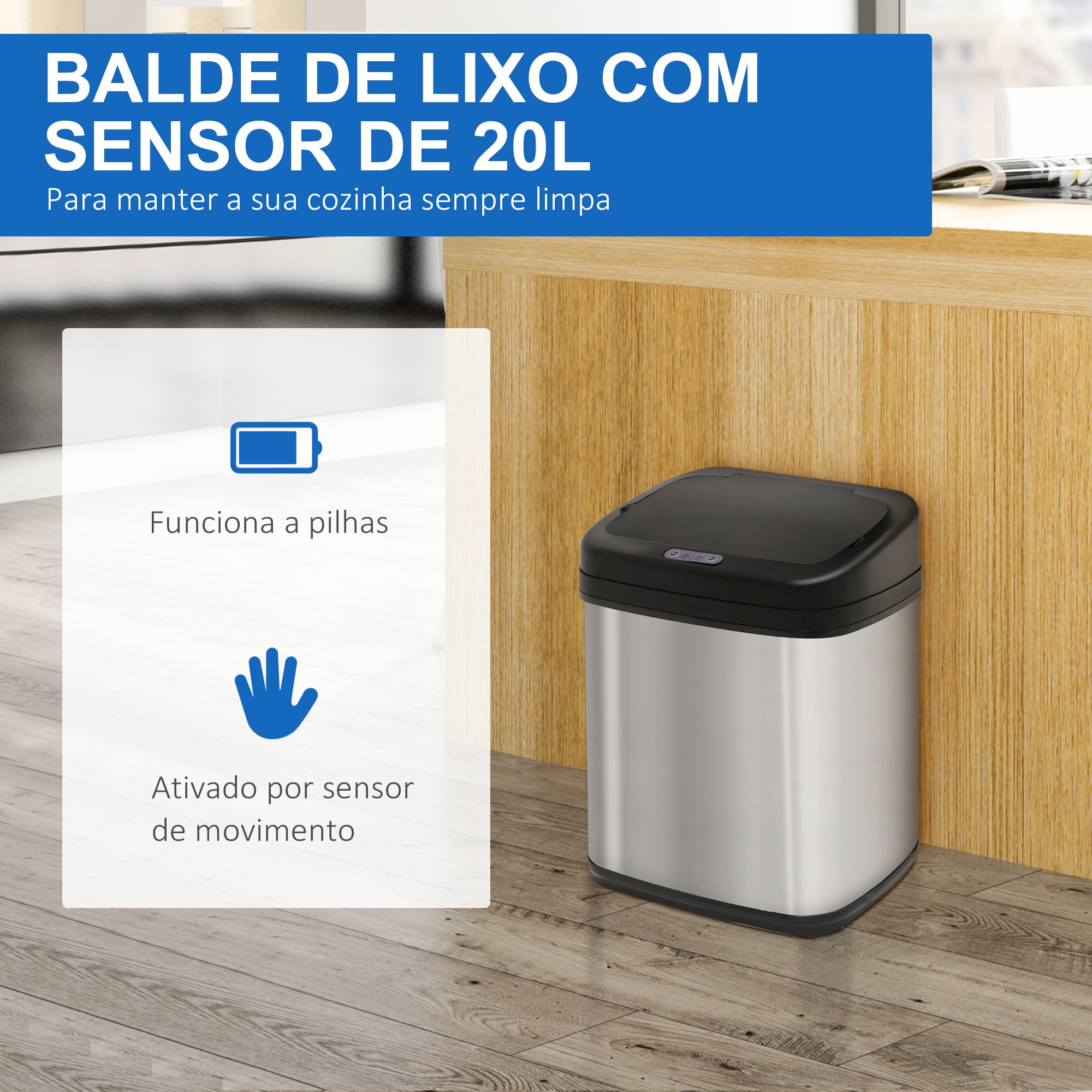 - Balde de lixo de 20L (volume interno de 15,5L) com desenho elegante em aço inoxidável Tecnologia infravermelha para abertura automática da tampa ao detectar movimento Funciona manualmente com botão na tampa Interruptor de liga/desliga na parte traseira da unidade Cubo interno removível com alça para fácil remoção dos resíduos Funciona com 4 pilhas AA (não incluídas), sem necessidade de instalação elétrica Baixo consumo de energia, ideal para uso diário em cozinhas