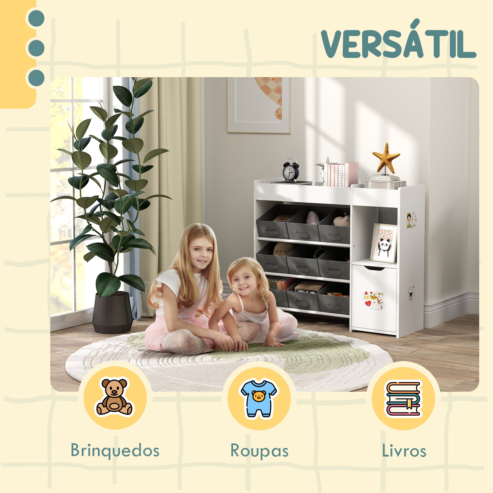 - Organizador de brinquedos branco, ideal para qualquer divisão Inclui 9 cestos amovíveis em tecido não tecido suportados por hastes metálicas Possui 2 compartimentos superiores com rebordos elevados, que funcionam como cestos Possui um compartimento aberto do lado direito e um armário com porta por baixo Os cantos arredondados oferecem maior segurança às crianças e ajudam a evitar acidentes A superfície laminada é fácil de limpar, o que facilita a sua manutenção Concebida para incentivar a autonomia das crianças, permite um acesso fácil aos seus brinquedos Inclui 3 autocolantes decorativos para personalizar o móvel se quiser Montagem necessária