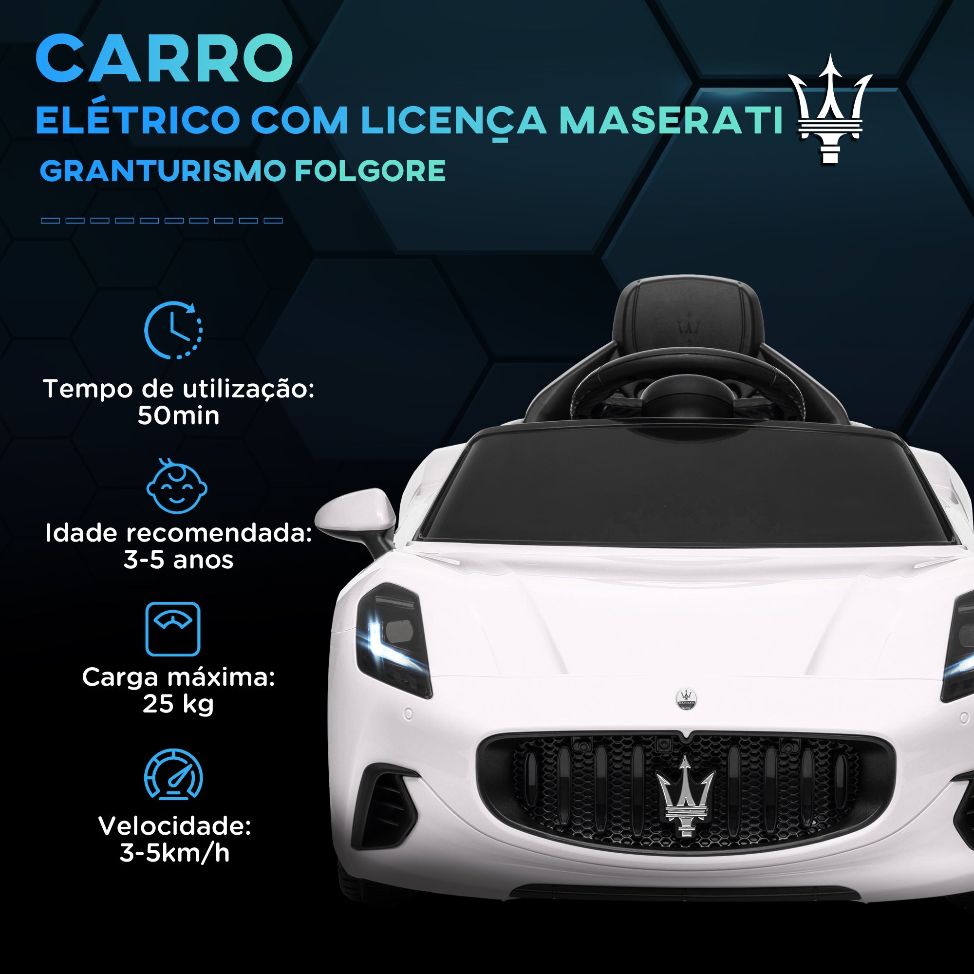 Carro Elétrico para Crianças acima de 3 Anos Carro Maserati Gran Turismo Folgore Carro Elétrico com Bateria 12V Controlo Remoto Faróis Buzina e Música MP3 98x59x43 cm Branco