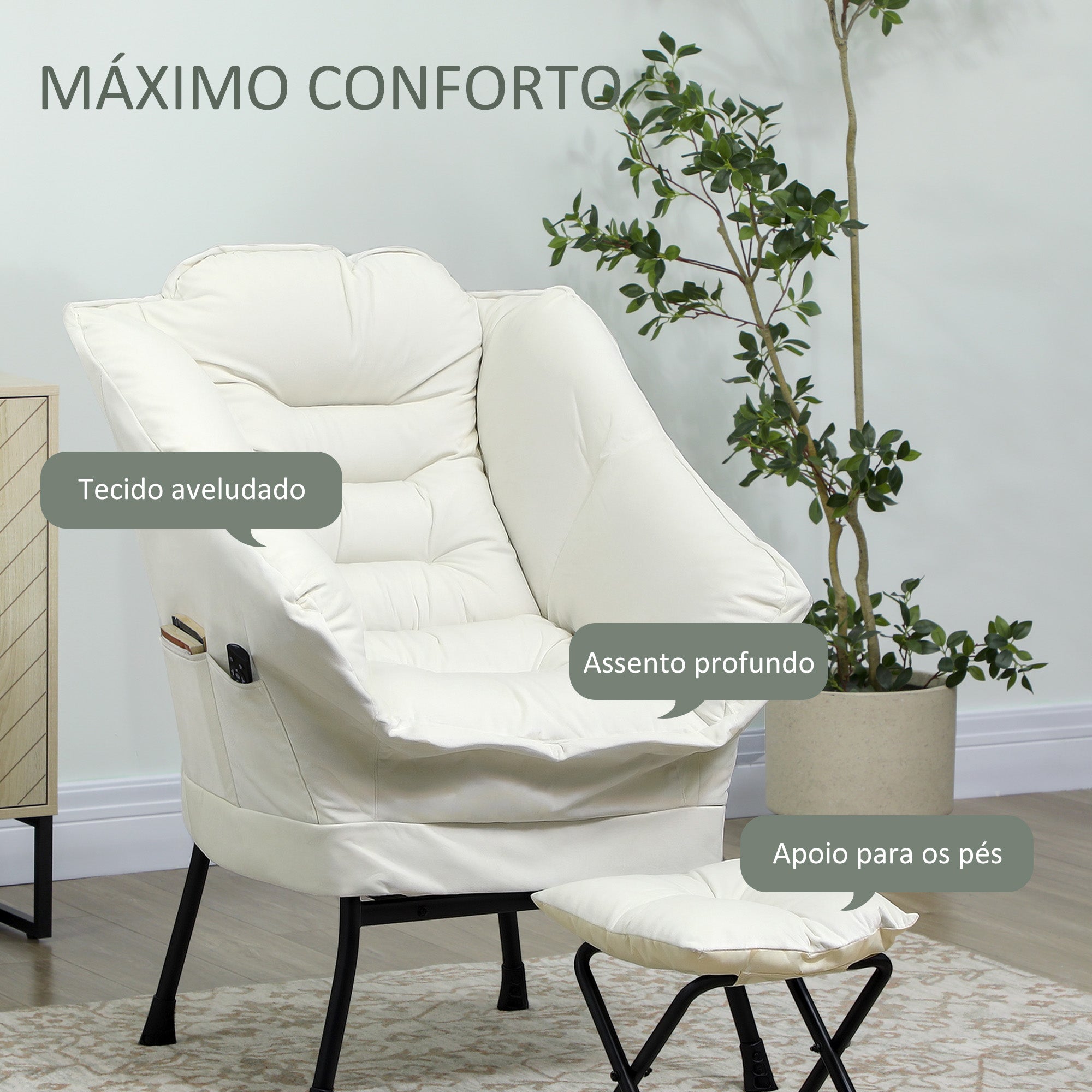 • ESTILO PARA TODOS OS ESPAÇOS: Com um desenho atual e atrativo, esta poltrona com apoio para os pés é perfeita para qualquer ambiente, do escritório à sala de estar. A sua cor neutra e o formato minimalista garantem uma harmonia visual e funcional