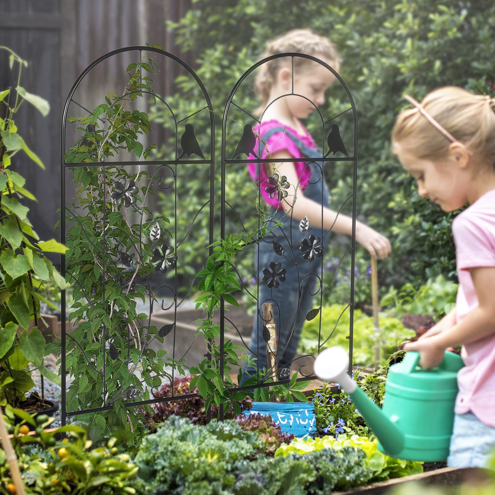 - Conjunto de 2 treliças metálicas decorativas Pode ser utilizada como vedação de jardim, divisor de ambiente, barreira para animais ou simplesmente como decoração de pátio Decorado com trevo de quatro folhas e formas de pássaros Estrutura de aço com revestimento em pó, adequada para uso em exteriores Recomenda·se fixar as estacas inferiores no solo ou na relva para facilitar a montagem e garantir a estabilidade Fácil de montar