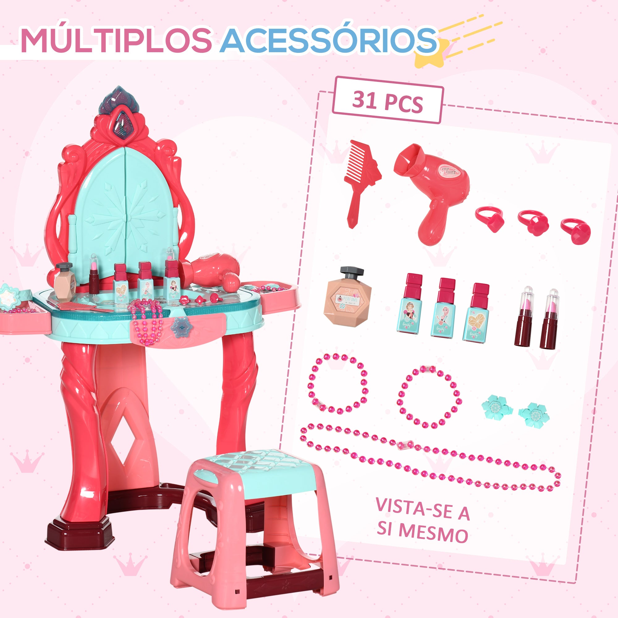 - LUZ E SONS: Belo conjunto de toucador infantil e banquinho combinando para os pequenos da casa se divertirem enquanto fazem o cabelo, maquiagem, etc. Espelhados e bem acabados como os toucadores das princesas do cinema e com luzes coloridas, música e acessórios de moda!