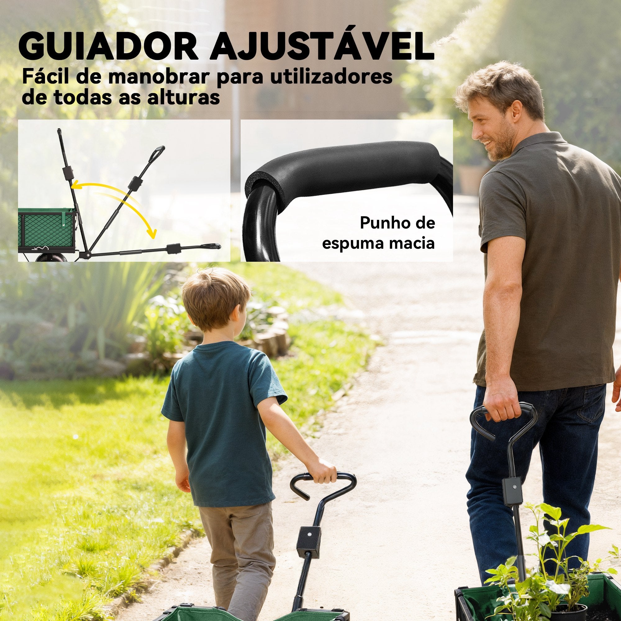 • DESENHO FLEXÍVEL: Este carrinho de jardim adapta·se às suas necessidades, com lados e extremidades que podem ser removidos para transformá·lo numa plataforma plana, adequada para diferentes tipos de carga