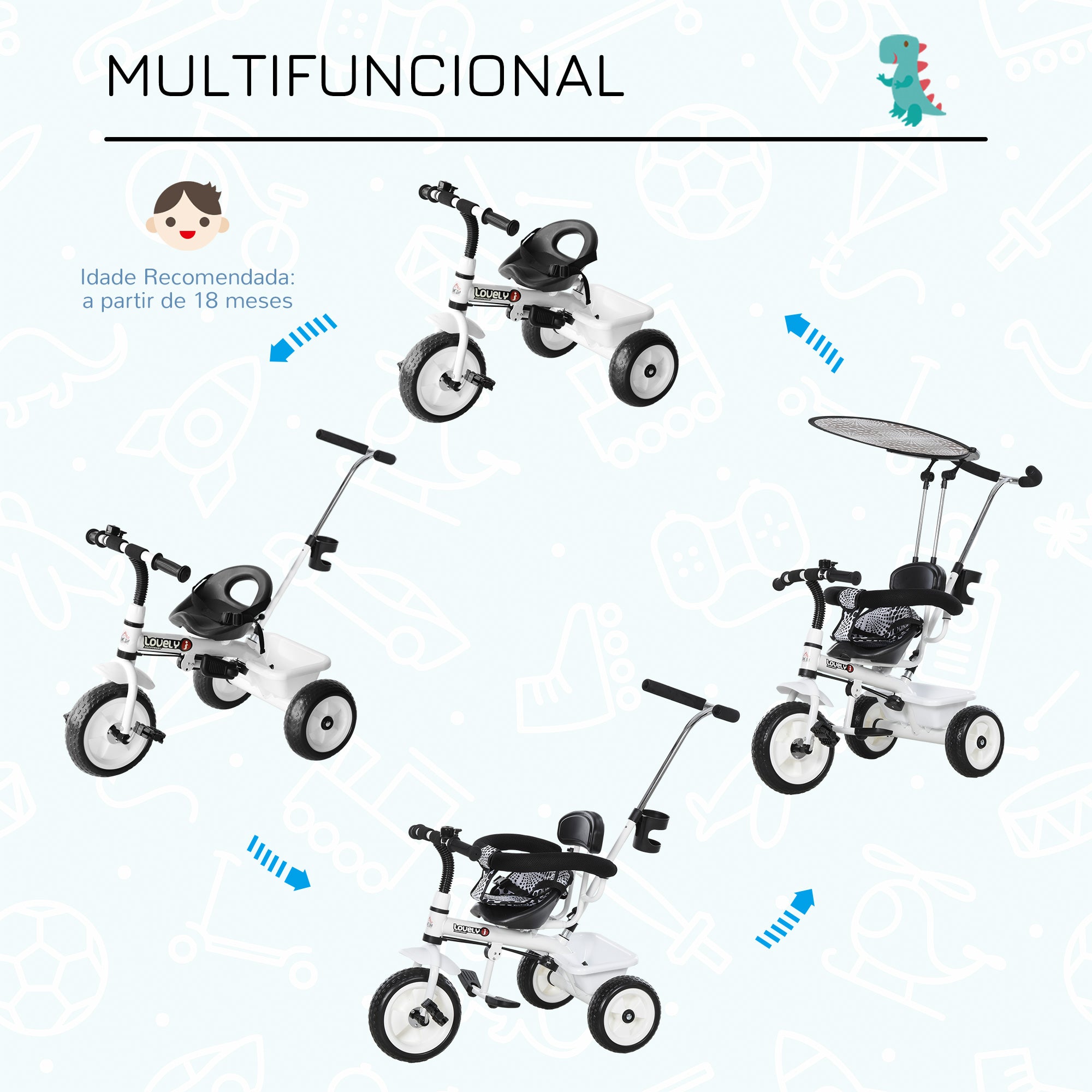 - Barra telescópica removível para os pais empurrarem o triciclo