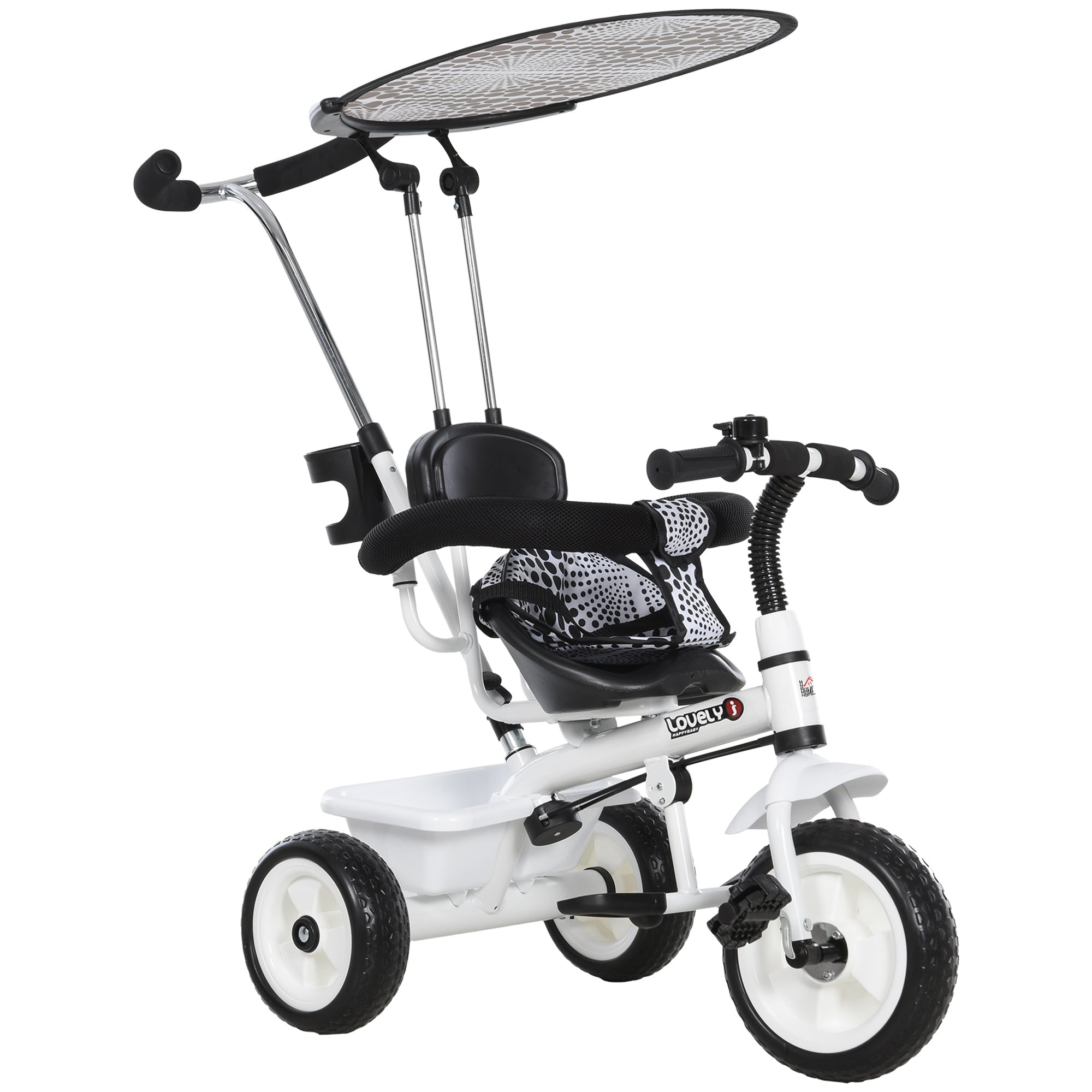 - equipado com guarda-lamas na roda dianteira, rodas de segurança que evitam que as crianças se magoem, uma capota removível e dobrável que protege do sol, uma barra de proteção, cinto de segurança, pedais dobráveis e um cesto de arrumação para guardar os objetos da criança. Este modelo inclui uma barra telescópica removível para os pais poderem conduzir o triciclo, enquanto a criança aprende a pedalar ou quando está cansada. É um triciclo ideal para crianças e pais. Os seus filhos vão divertir-se durante o passeio de família!