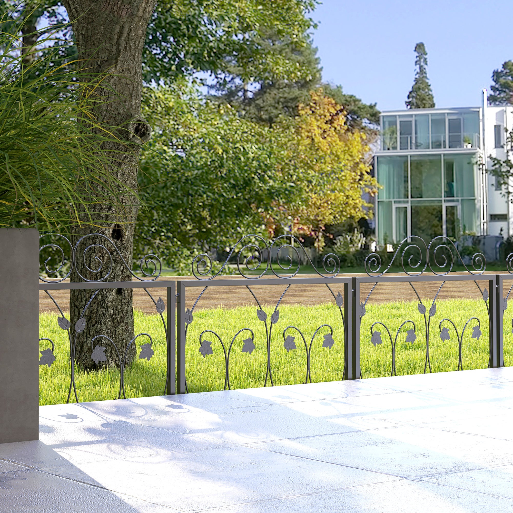 • Vedação exterior composta por 4 painéis individuais com bonitos detalhes de redemoinhos e folhas em ferro forjado Pode ser utilizada de várias formas, como por exemplo, como vedação de jardim, cerca para animais, borda para flores, partição de espaço ou decoração Os 4 painéis desta vedação de jardim são feitos de aço com revestimento em pó para maior resistência às condições climáticas O desenho dos painéis individuais permite montá·los de diferentes formas ou ângulos para se adaptarem aos seus espaços Conecta os painéis facilmente entre si, graças ao seu desenho de encaixe Inserção no solo com estacas para uma instalação estável Requer montagem