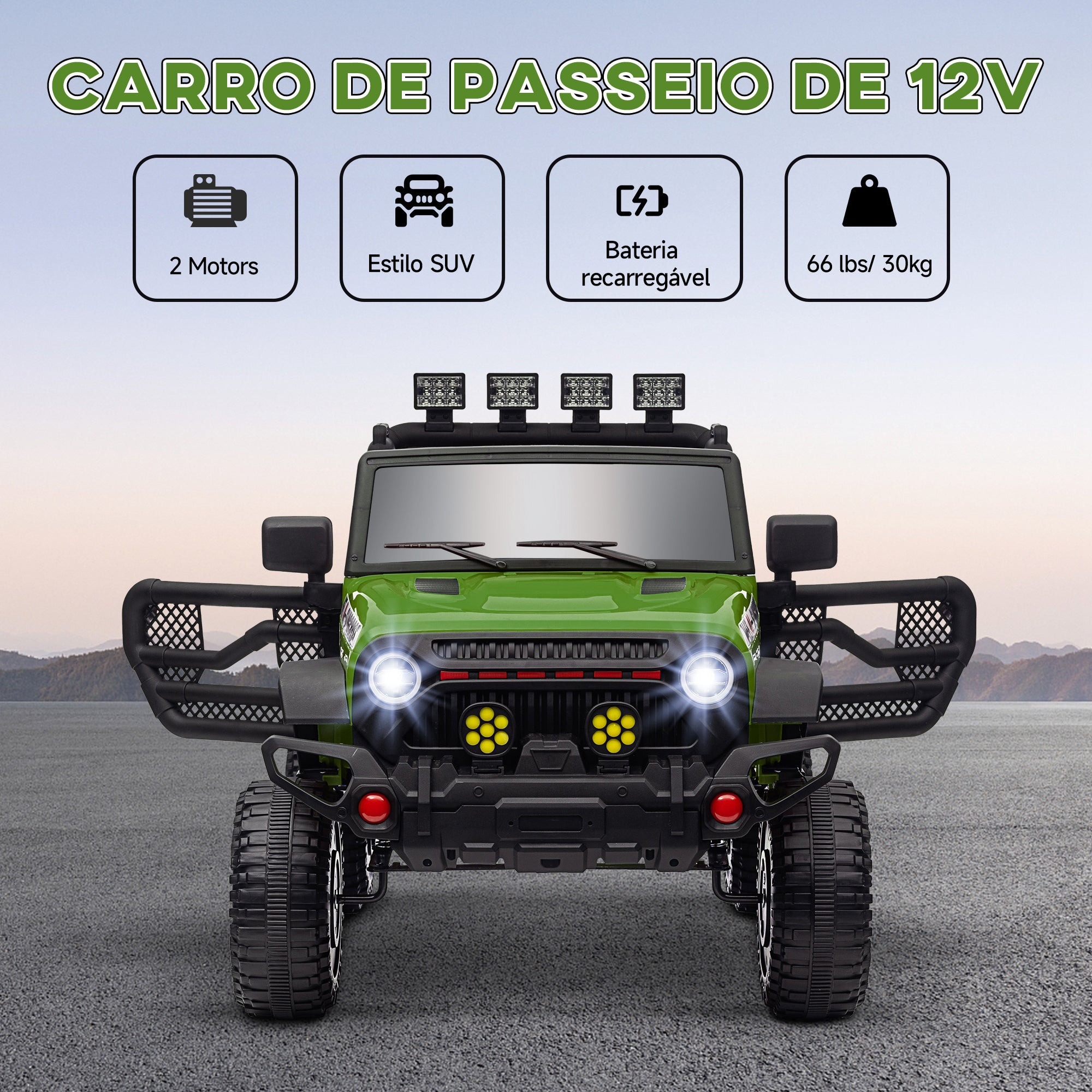 - Carro elétrico para crianças de 12V possui motores duplos para um desempenho potente Seu desenho inspirado em SUVs oferece um passeio elegante e aventureiro As rodas com absorção de impactos garantem uma condução suave e estável O mecanismo de arranque gradual aumenta a segurança ao evitar movimentos bruscos Três velocidades ajustáveis com controlo remoto proporcionam diferentes níveis de diversão Permite que as crianças conduzam sozinhas, promovendo a independência Equipado com bluetooth, música e buzina para uma experiência interativa e divertida Requer montagem