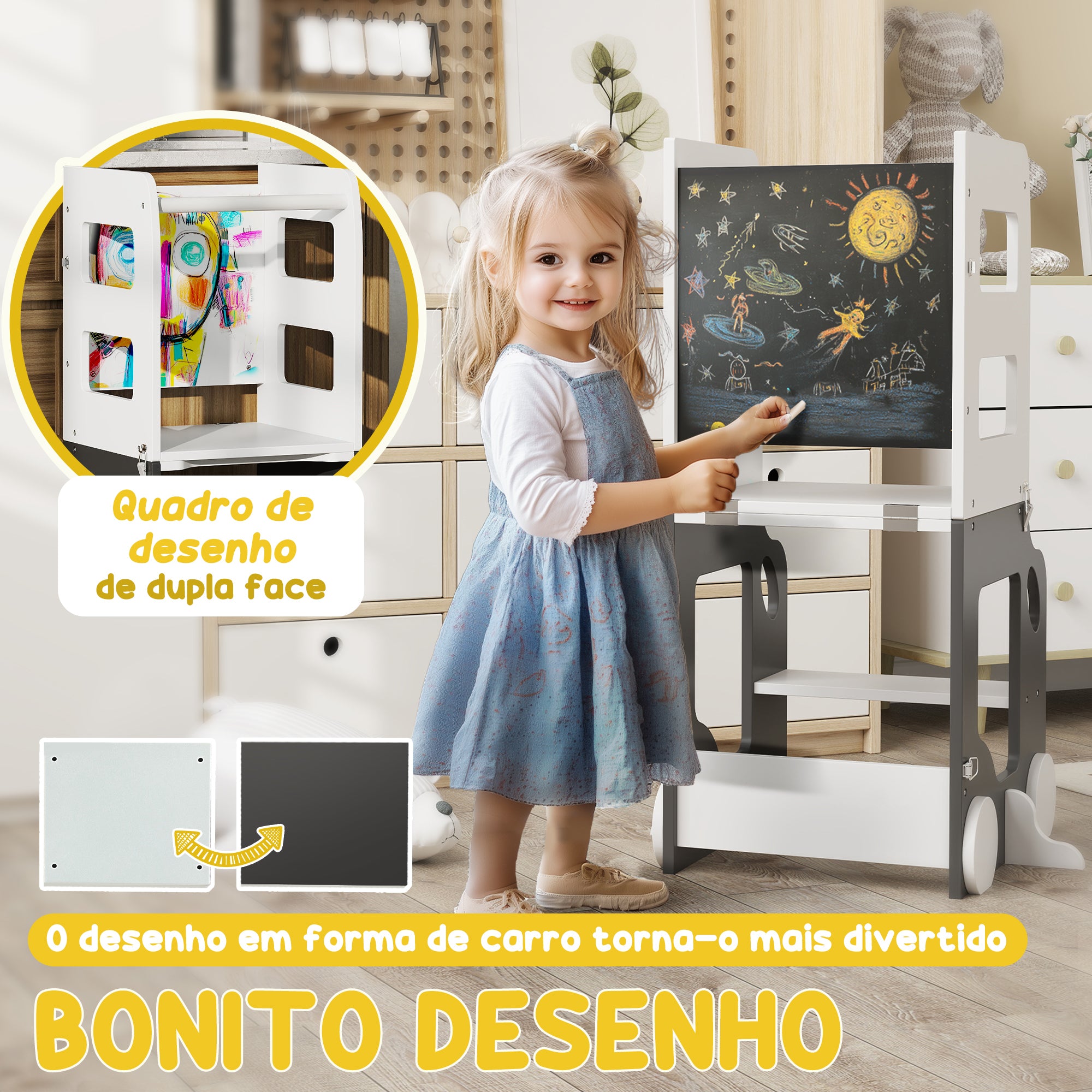 Torre de Aprendizagem 4 em 1 Torre de Aprendizagem para Crianças acima de 3 Anos em Forma de Carro Convertível em Mesa e Cadeira com Ardósia Barreira de Segurança 58x46x92 cm Branco e Cinza