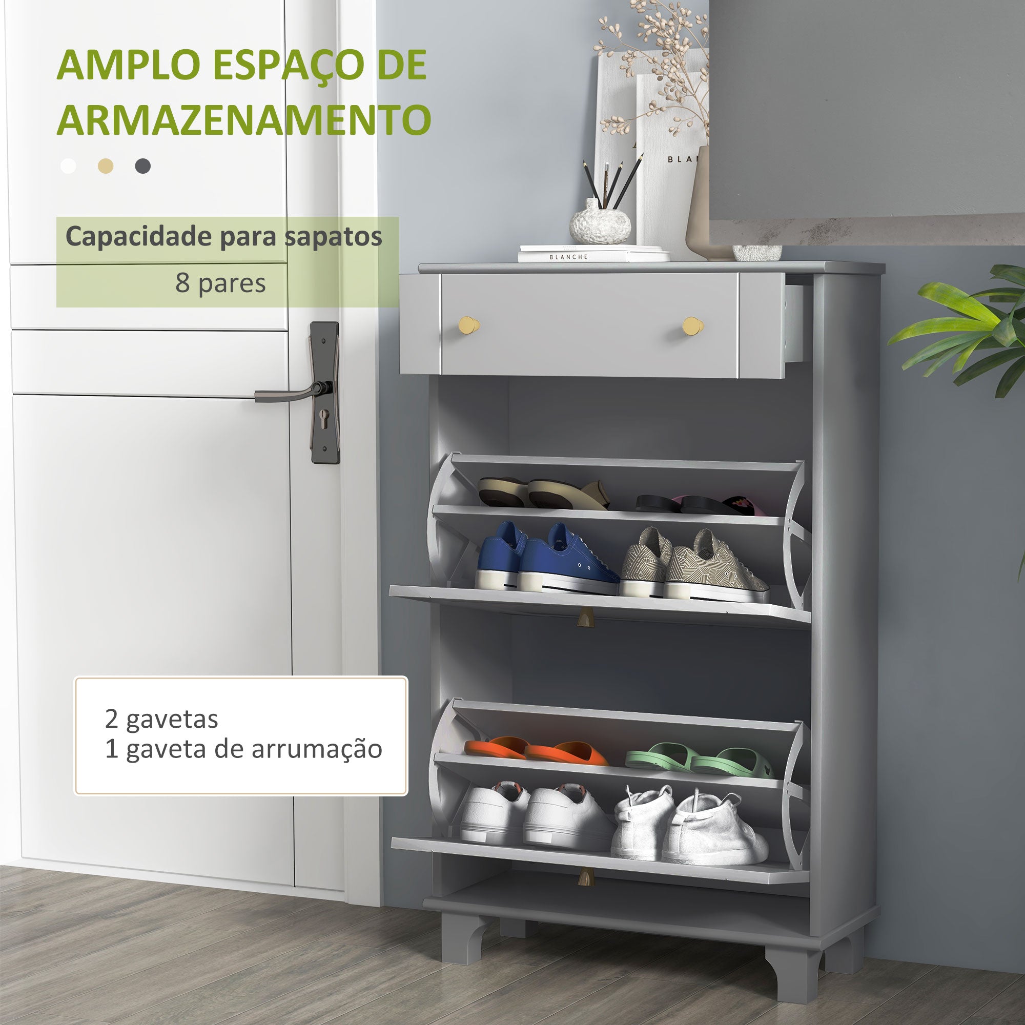- Sapateira de estilo moderna cor neutra e puxadores dourados Pode armazenar até 8 pares de sapatos nos dois compartimentos basculantes Possui uma gaveta na parte superior para chaves e outros pequenos acessórios As prateleiras internas são ajustáveis em 2 níveis ou amovíveis para atender calçados de diferentes alturas Fácil de limpar com um pano macio e húmido Desenho compacto, ideal para pequenas entradas, corredores ou locais estreitos Possui um sistema anti·tombo para maior estabilidade e segurança Base elevada para facilitar a limpeza Requer montagem
