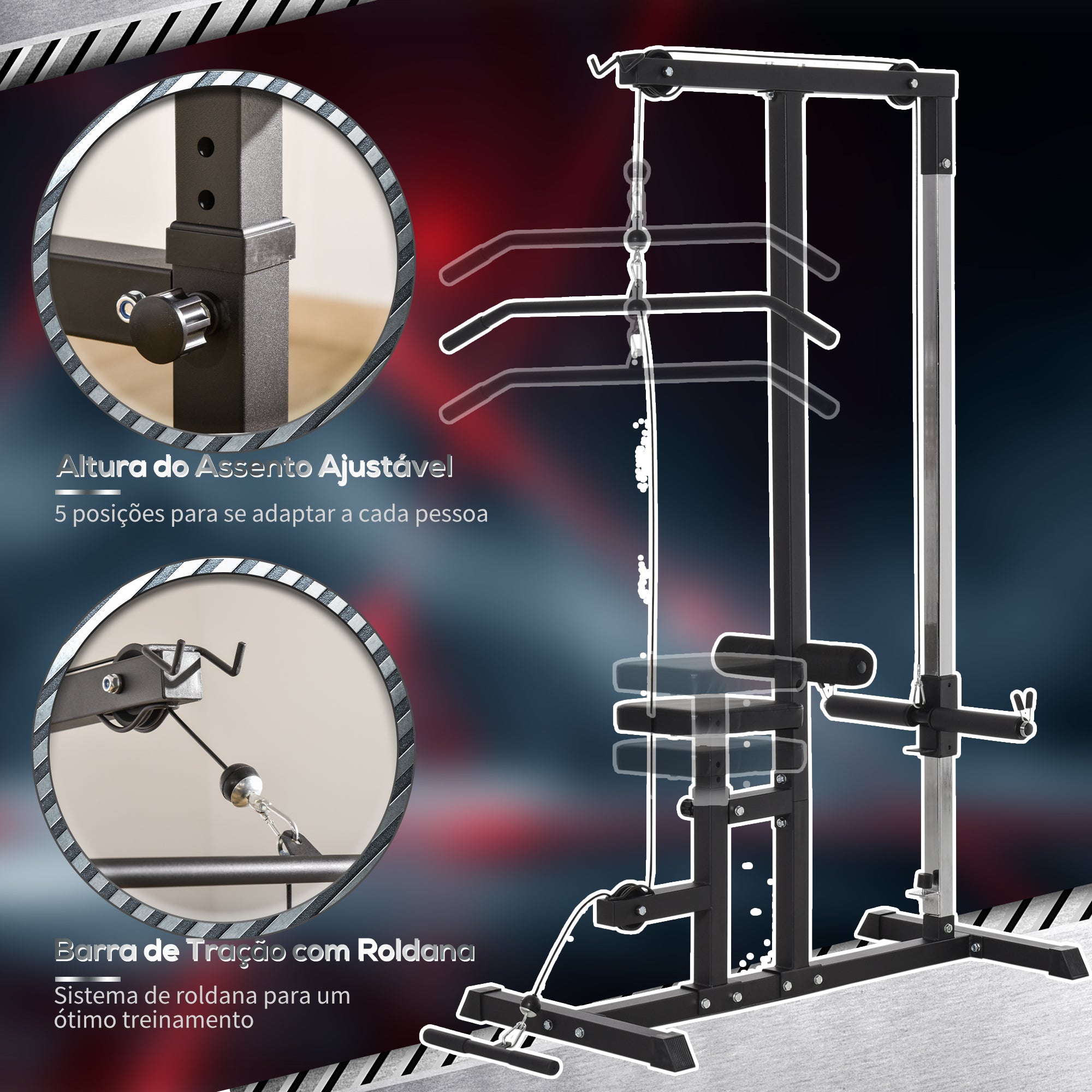- MÁQUINA DE MUSCULAÇÃO: Fortalece os músculos do bíceps, antebraços, ombros, trapézio e tríceps puxando a barra de pull