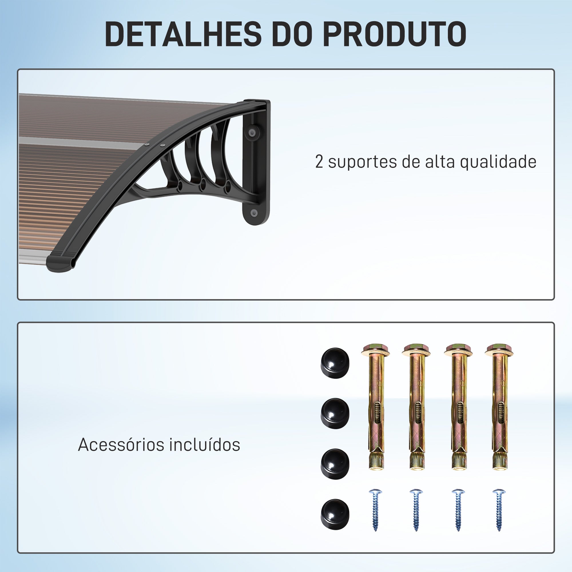 - PAINÉIS DE POLICARBONATO: Marquise fabricada com placas de policarbonato de 5 mm, resistentes e atóxicas. Seu formato curvo oferece proteção abrangente e ajuda a prevenir o acúmulo de neve e chuva