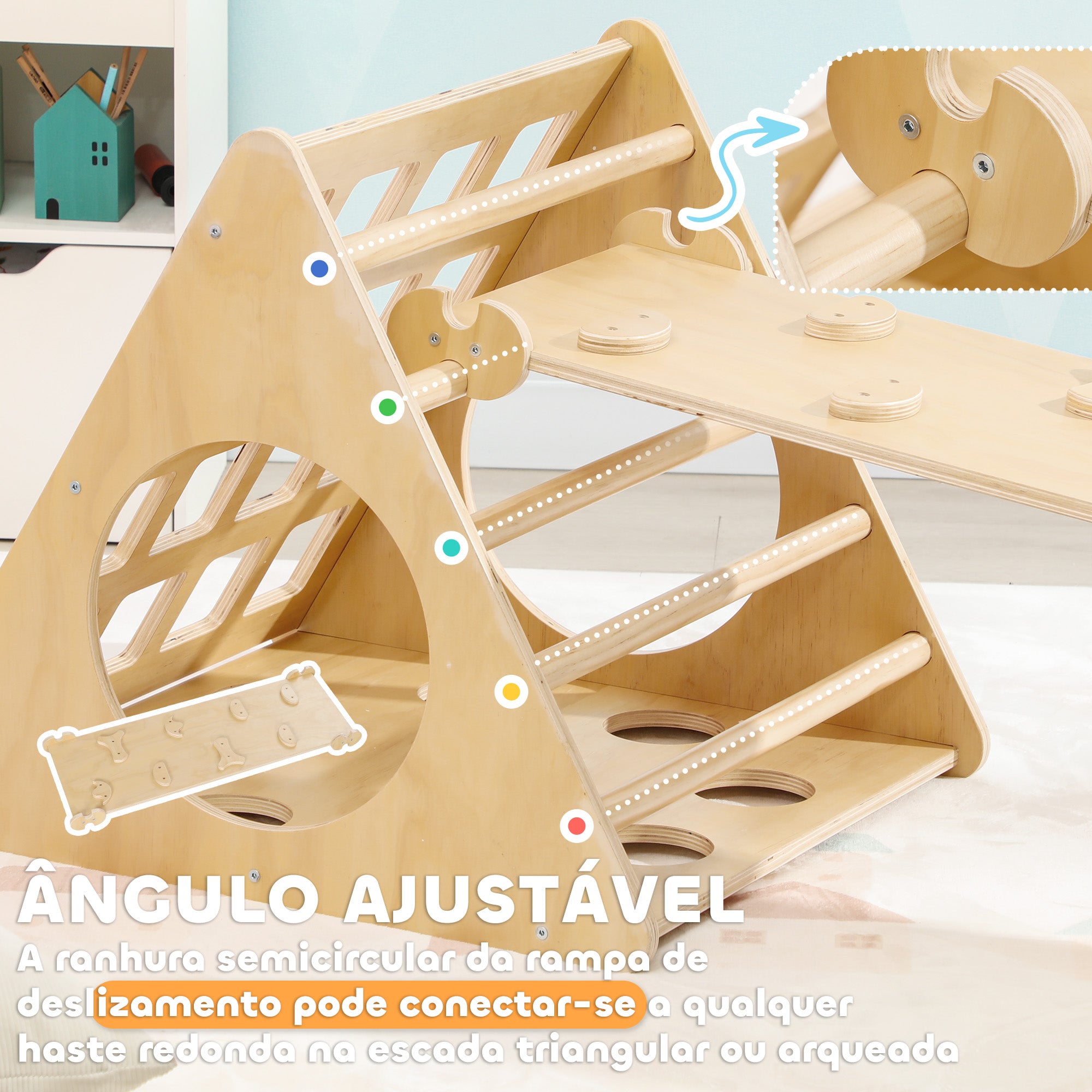 • Conjunto de 3 peças, mas oferece até 8 opções de jogo diferentes e múltiplas combinações O trepador triangular inclui uma escada, uma grelha e uma tábua com orifícios para atirar A escada em arco também pode ser utilizada como uma divertida gangorra O tabuleiro de dupla face foi concebido para trepar e deslizar Inclui dois sacos de areia perfeitos para os jogos de arremesso Fabricado em madeira de pinho multi·laminada com uma superfície lisa para maior segurança O ângulo do escorrega ajusta·se para oferecer uma variedade de experiências de jogo Suporta até 50 kg, adequado para duas crianças pequenas Necessita de montagem