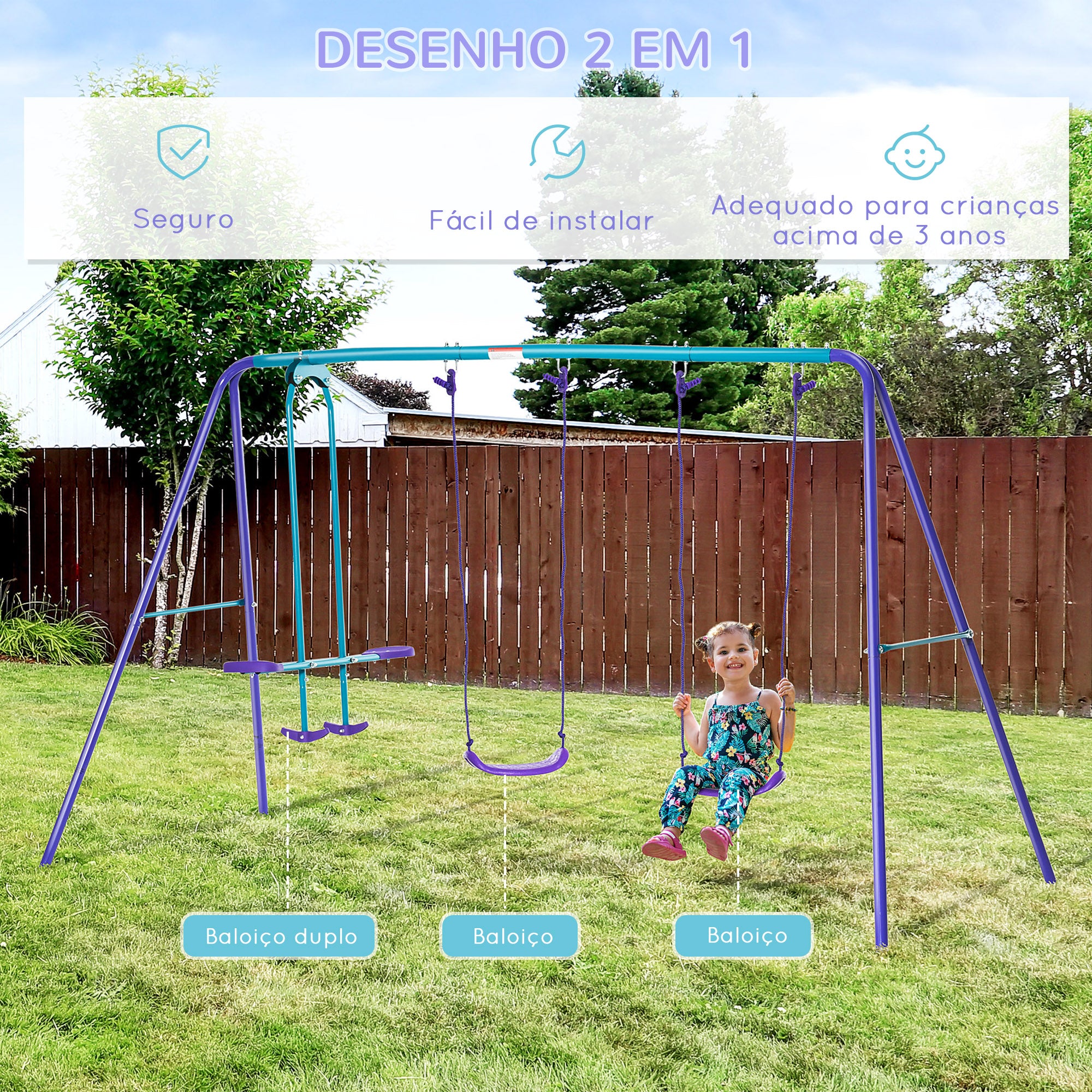 - Cor: Azul e roxo Material: Metal, PE Medidas totais: 280x140x178 cm (CxLxA) Medidas do baloiço individual: 35x17,3 cm Medidas do baloiço duplo: 101x20 cm Altura do baloiço duplo a partir do solo: 68 cm Carga máxima: 90 kg (balanço duplo), 45 kg (balanço simples), 180 kg (total) Certificações: CE·EN71·1·2·3·8 ASTM F963, CPSIA Referência: 344·035 O pacote inclui: