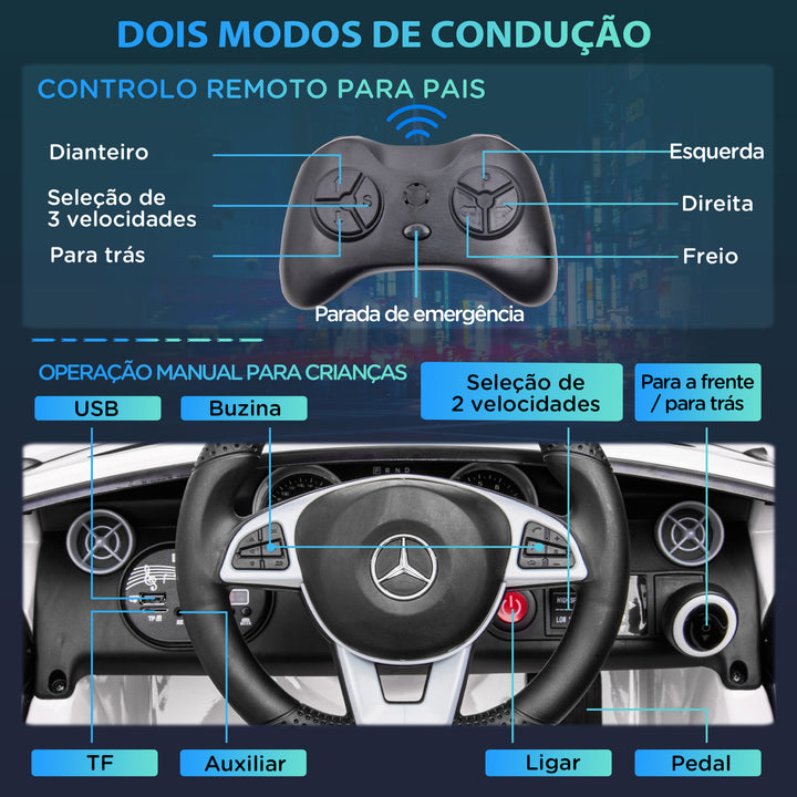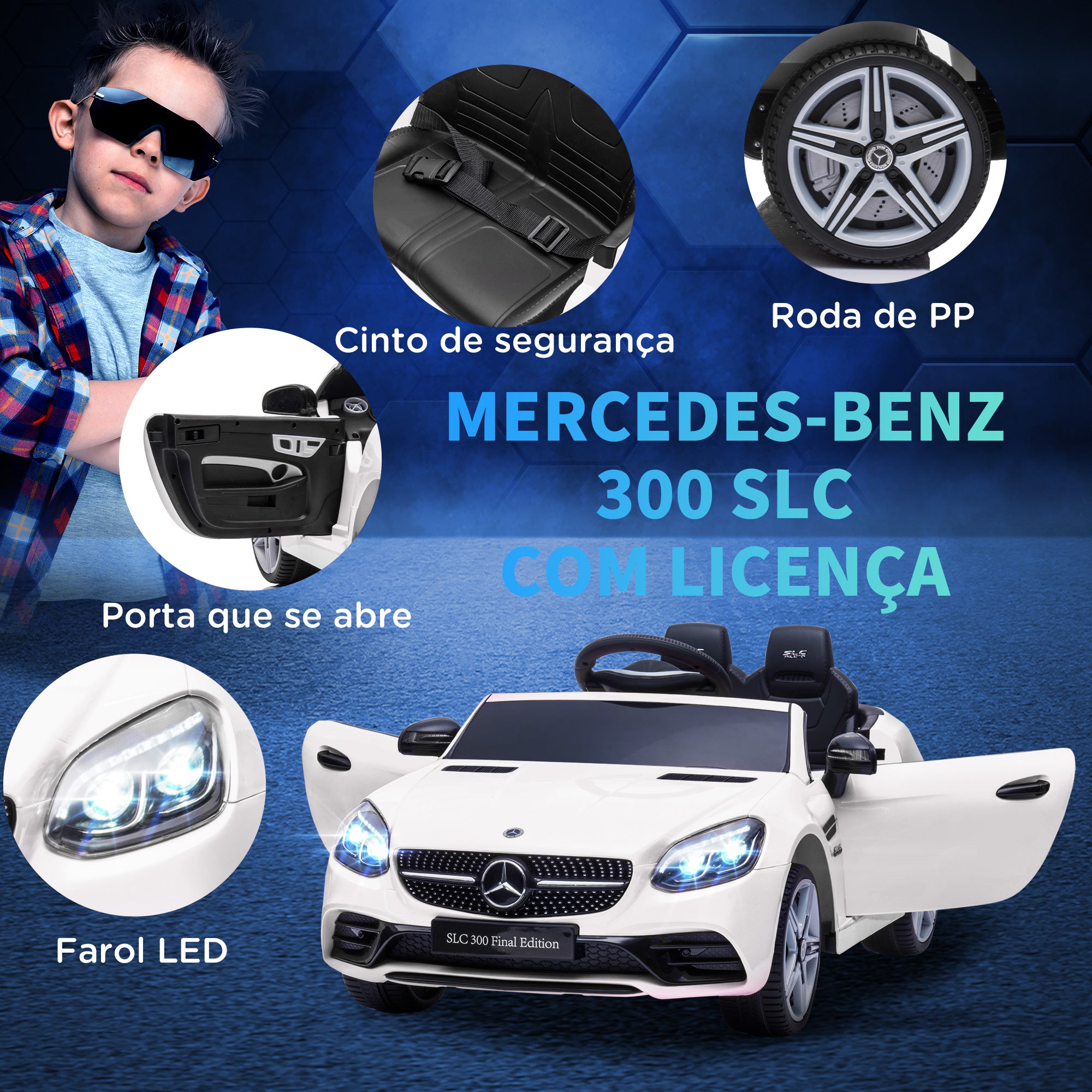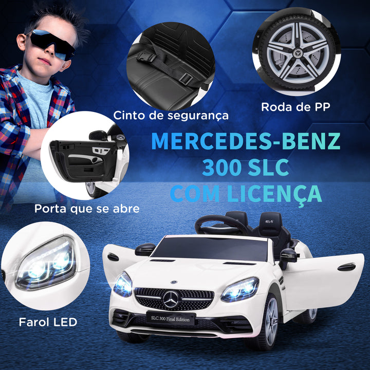 Carro Elétrico Mercedes SLC 300 12V para Crianças de 3-6 Anos com Controlo Remoto Faróis LED Buzina Música TF USB e Abertura da Porta 3-5km/h 107x62,5x44 cm Branco