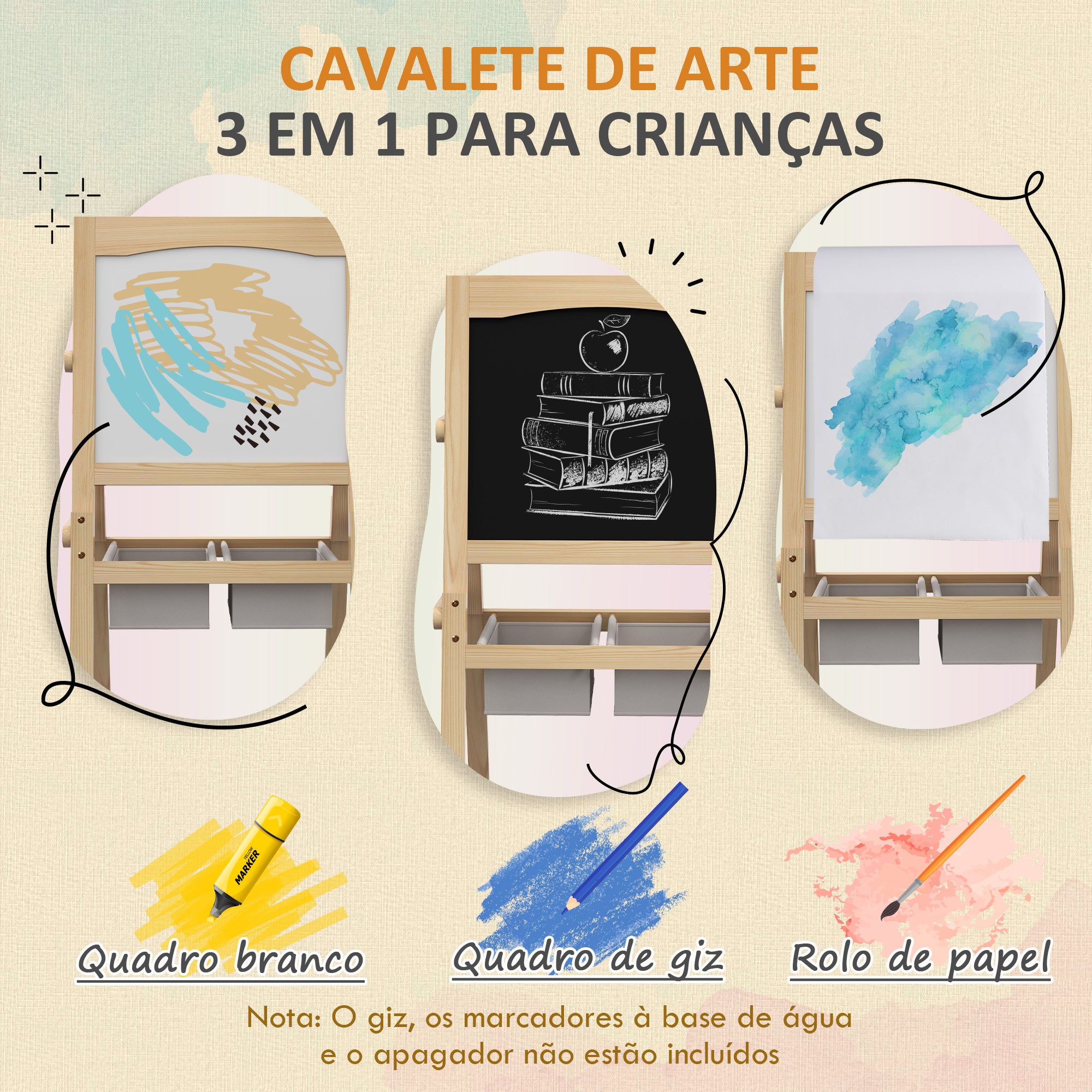 Cavalete para Crianças 3 em 1 Cavalete Duplo com Quadro preto e Quadro Branco Cavalete de Madeira para Desenhos com Rolo de Papel e 2 Cestas 58x50,5x109 cm Madeira