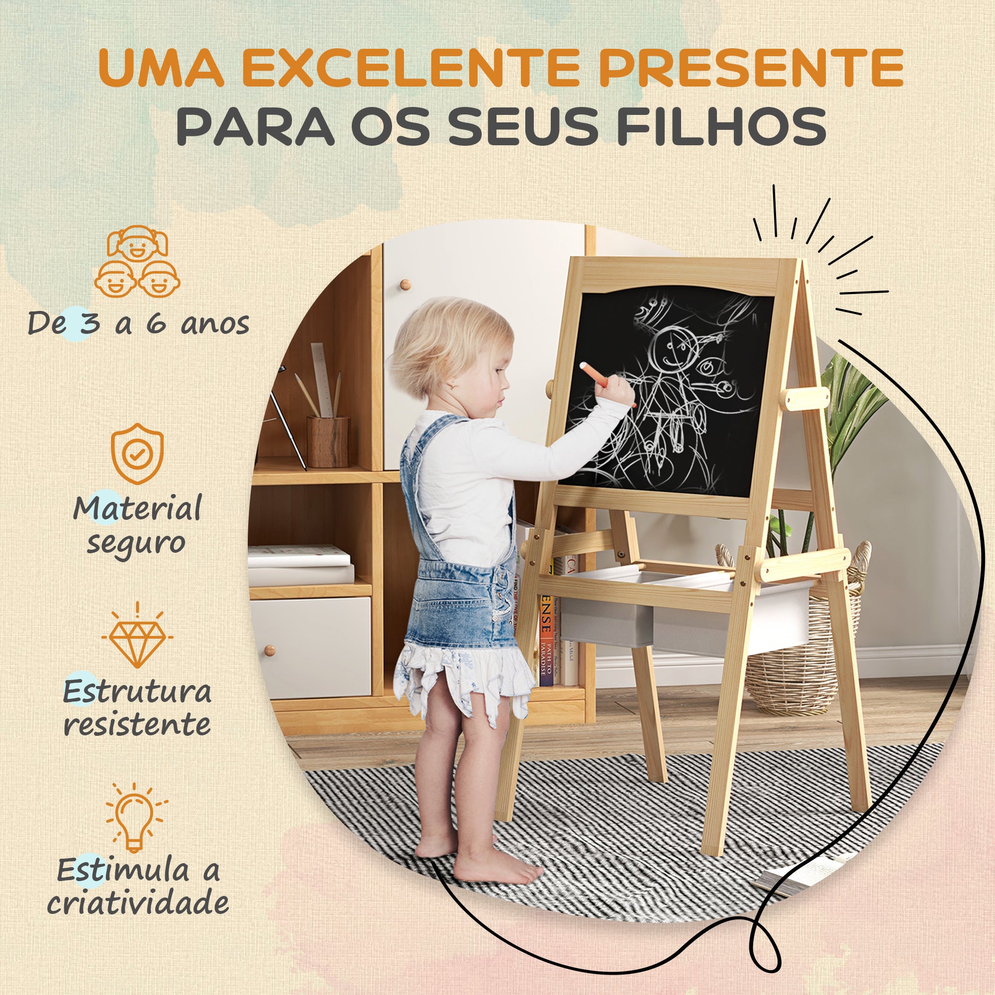 • Desenho 3 em 1 com lousa, quadro branco e rolo de papel Possui dois cestos de arrumação para ter giz, marcadores, apagador, etc. à mão. (não incluídos) Adequado para crianças dos 3 aos 6 anos, para que possam utilizálo confortavelmente em pé ou sentados A estrutura em A e a construção robusta em MDF e madeira de pinho tornam o cavalete estável e seguro de usar O acabamento efeito madeira torna o cavalete fácil de integrar na decoração da sua casa Fácil de montar