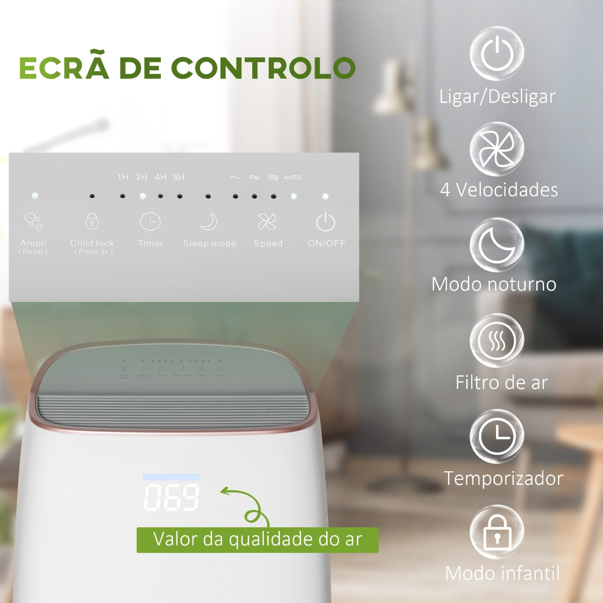 • MEDIDAS TOTAIS: 30x17x53cm (CxLxA). Ruído de trabalho: =61dB. Potência: 45W. Certificações: CE (EMC, ROHS, LVD, ERP). Não requer montagem Melhore a qualidade do ar com este purificador de ar com filtro da HOMCOM. ideal para criar uma atmosfera saudável livre de poeiras, ácaros, fumaça e odores leves. Com um sistema de purificação de 3 camadas, 4 velocidades e 2 modos de funcionamento e temporizador, este purificador é eficiente para áreas de até 28m². É ideal para quem sofre de alérgias e pode assrgurar um ar limpo a sua casa de forma simples e eficiente