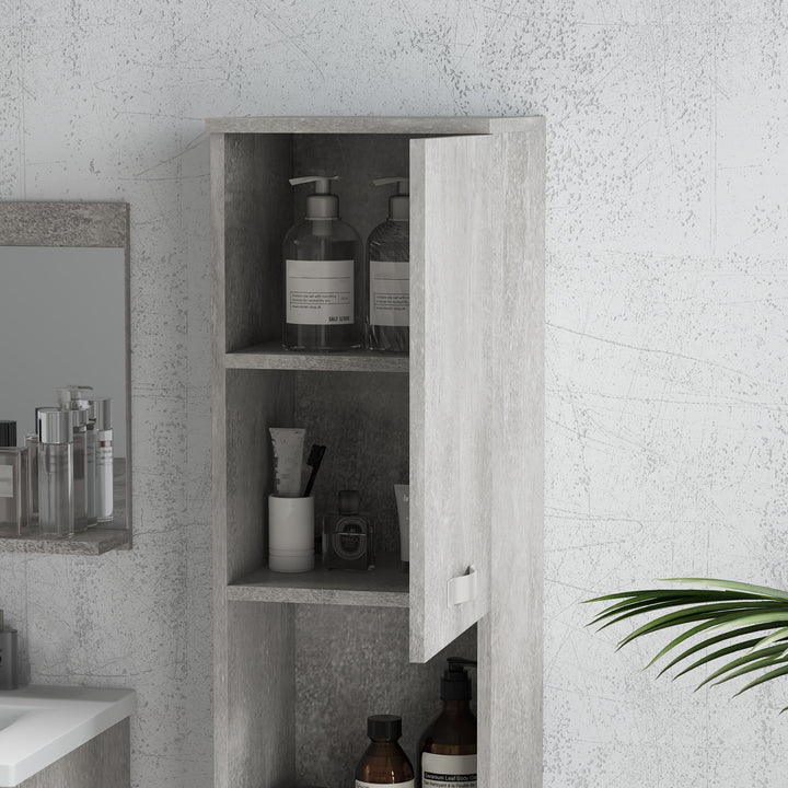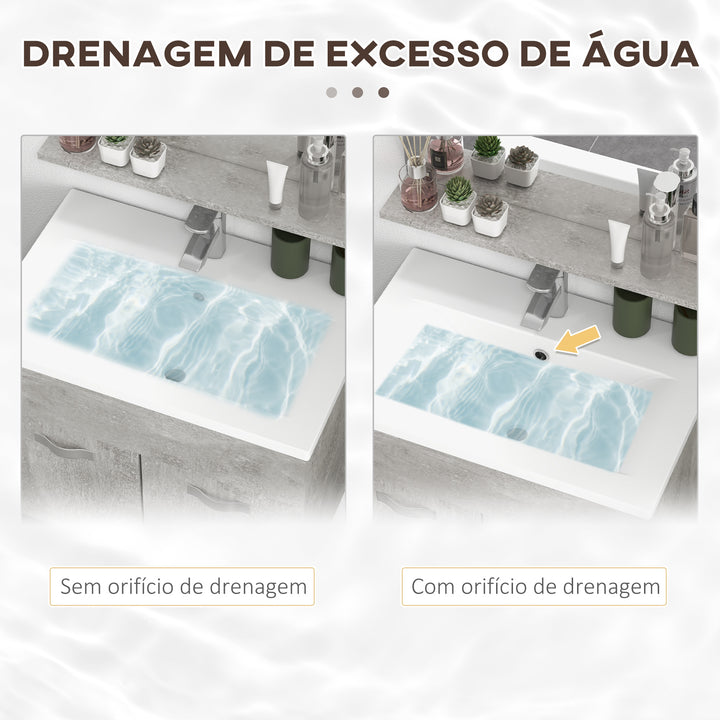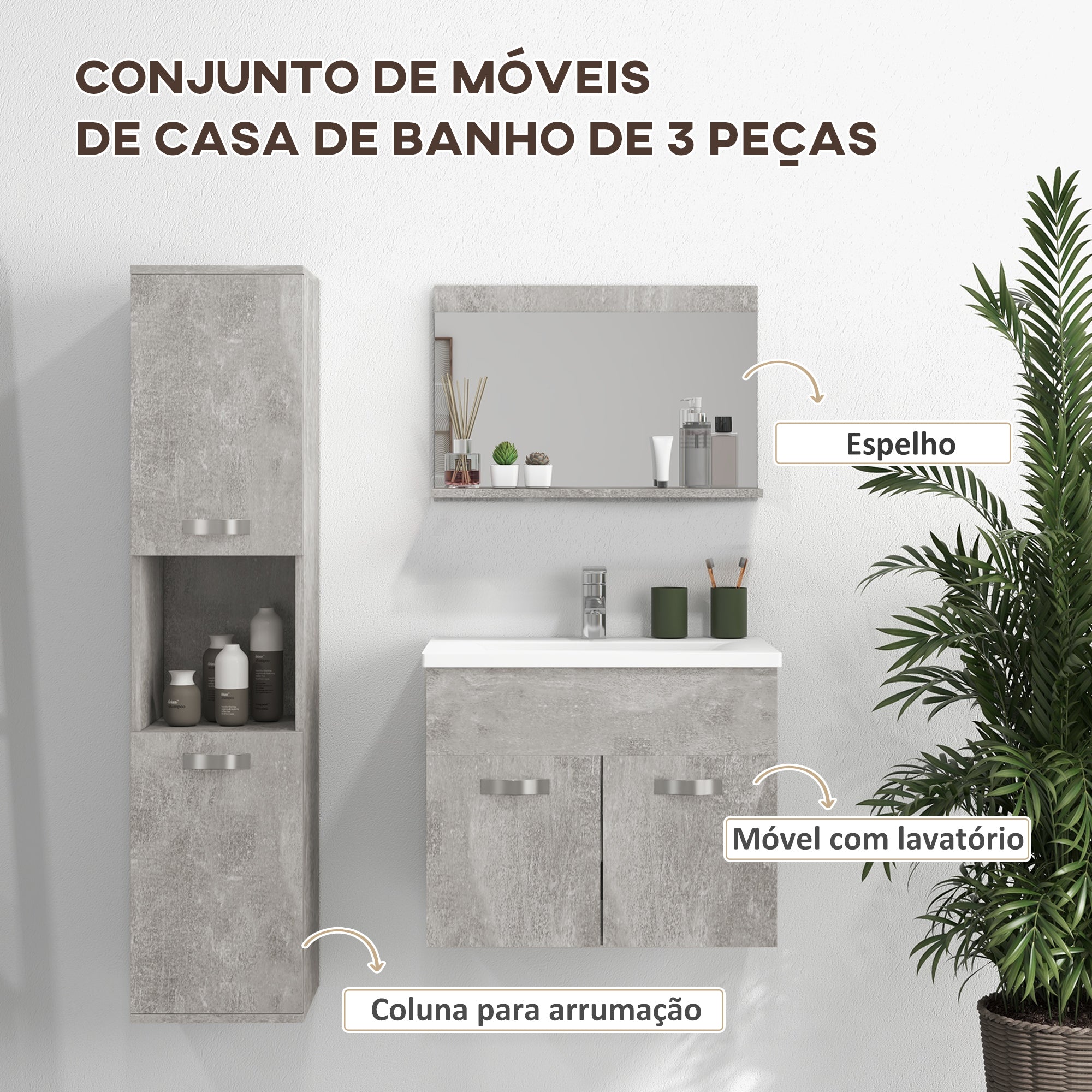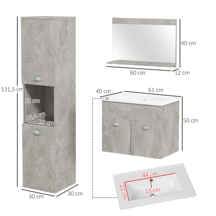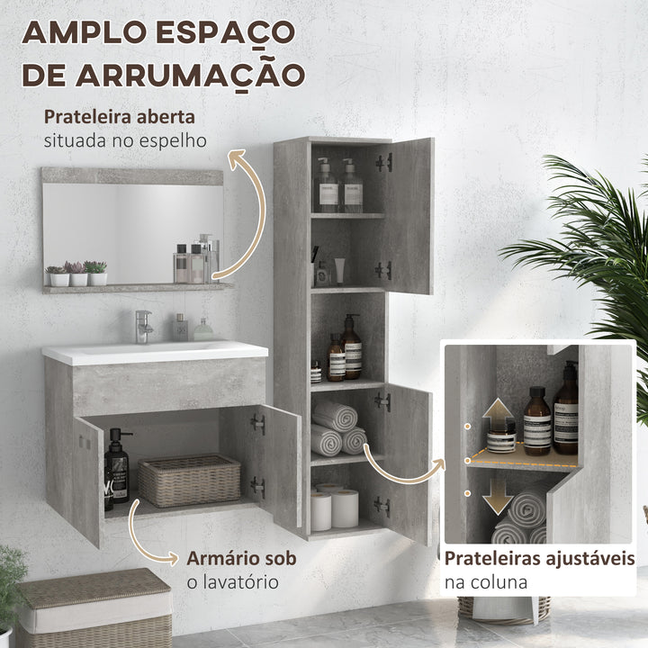Conjunto de Móveis para Casa de Banho de Parede 3 Peças Inclui Espelho com Prateleira Móvel com Lavatório Cerâmico e Coluna de Casa de Banho Estilo Moderno Cinza