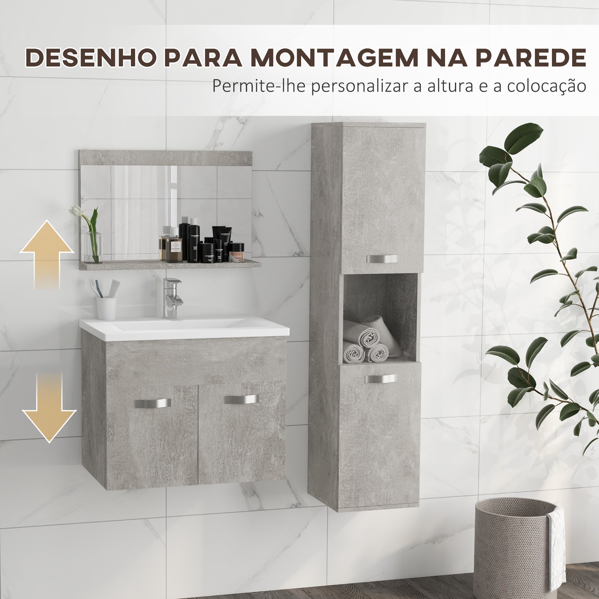 - Cor: Cinza Material: Melamina de madeira, cerâmica e vidro Medidas do espelho com prateleira: 60x12x40 cm (CxLxA) Medidas móvel com lavatório: 61x40x50 cm (CxLxA) Medidas da coluna de casa de banho: 30x30x131,5 cm (CxLxA) Medidas do lavatório: 61x40x19cm (exterior), 44x22x13cm (interior) Tamanho do orifício da torneira: Ø35mm Ralo do lavatório: Ø45 mm Carga máxima: 2kg (prateleira de espelho), 15kg (módulo lavatório), 2kg (prateleira interna do móvel de parede) Altura de instalação sugerida: 85 cm (a partir do solo) Referência: 834
