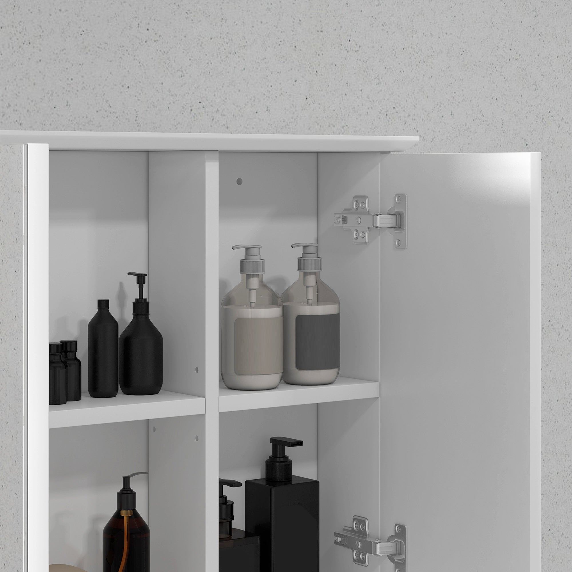 - Cor: Branco Material: MDF e vidro Medidas totais: 65x15x49 cm (CxLxA) Medidas do espelho: 40x46,5 cm (CxA) Medidas do interior do armário: 38,5x9,7x22/22 cm (direita), 19x9,7x22/21,5 cm (esquerda) Capacidade máxima de carga: 8 kg (total) e 2 kg (cada prateleira) Referência: 834·714V80WT