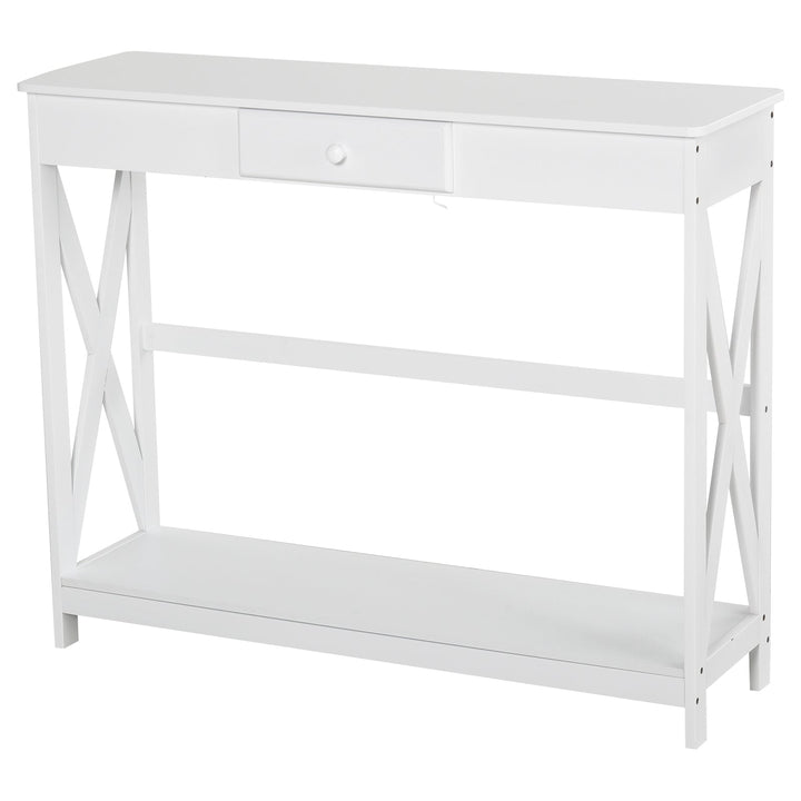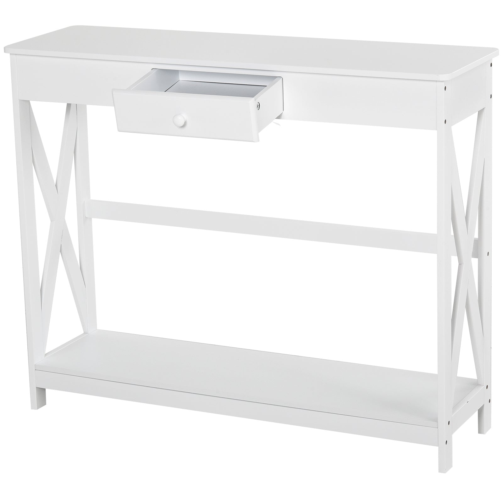 • MEDIDAS: 100x30x81cm (CxLxA). Capacidade de carga: 15 kg (mesa), 15 kg (prateleira) e 5 kg (gaveta). Este fantástico console da HOMCOM é ideal para ganhar espaço de armazenamento extra na entrada da casa ou em qualquer outro cômodo. Como é estreito, não ocupa muito espaço, tornandoo o auxiliar ideal para maximizar a capacidade de seus corredores. Seus lados X proporcionam ótima estabilidade e sua fabricação foi feita com MDF ecológico de classe E1 ecológica. Dê um toque extra de elegância à sua casa com este fantástico console de receção HOMCOM.