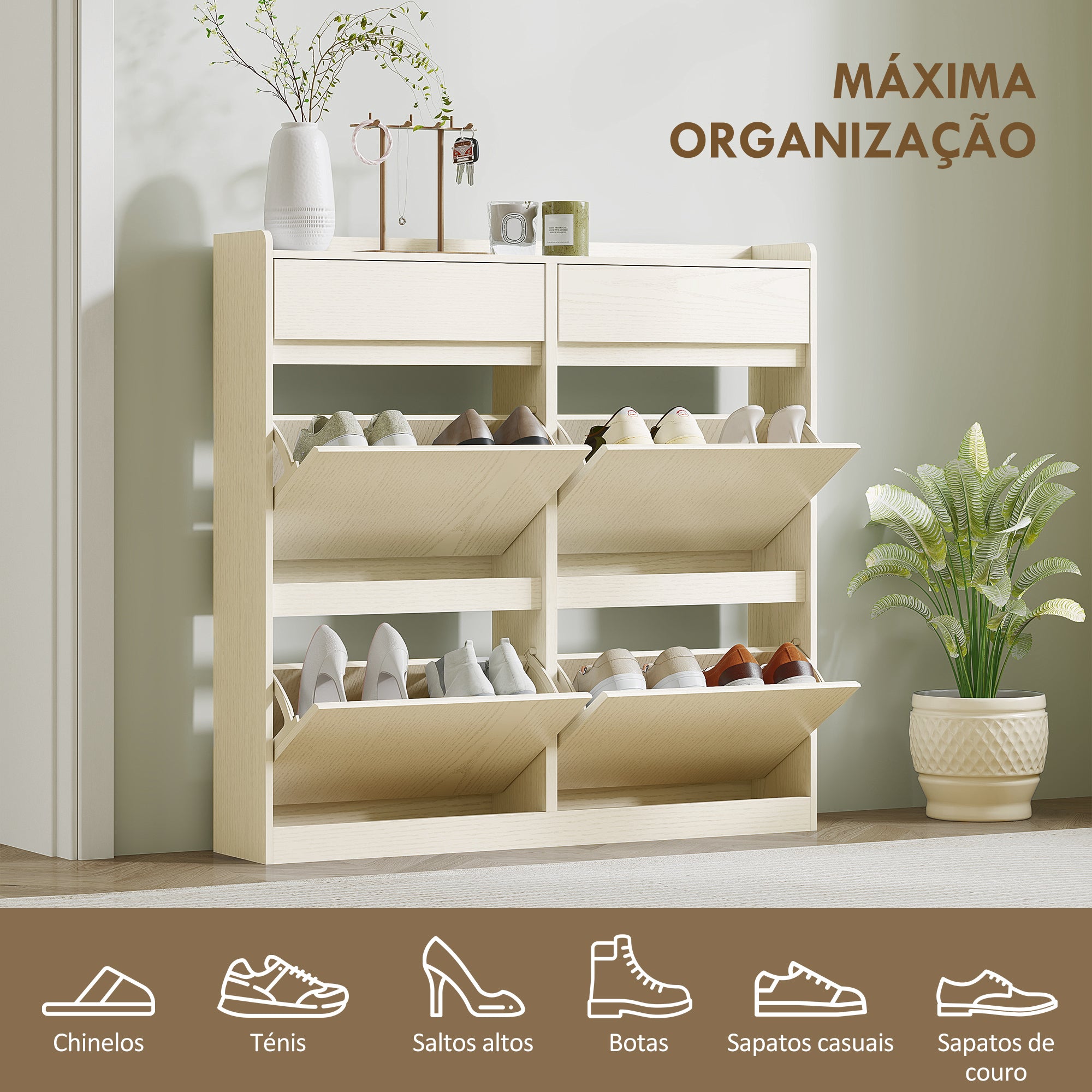 • Quatro compartimentos abatíveis com capacidade para até oito pares de sapatos (tamanho máximo EU43) O acabamento com imitação dos veios da madeira conferem um toque sofisticado Com apenas 19,2 cm de profundidade, adapta·se facilmente a espaços estreitos Pissui duas gavetas deslizantes perfeitas para armazenar carteiras, chaves e outros acessórios A superfície superior com bordas elevadas permite exibir a sua decoração de forma segura O sistema anti·tombo oferece maior estabilidade e segurança O desenho da parte traseira semi aberta proporciona boa ventilação aos sapatos Requer montagem