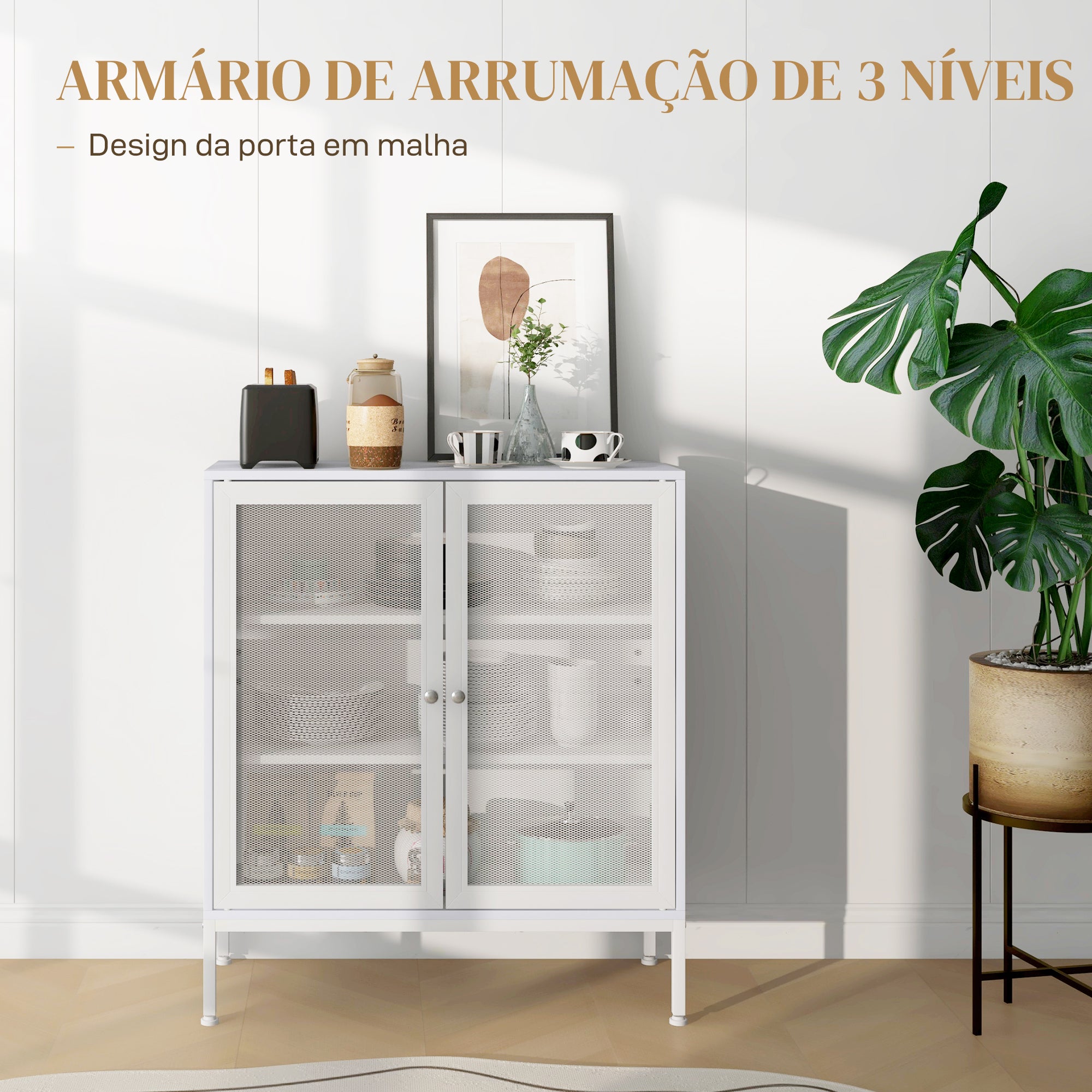Aparador de 3 Níveis Móvel Auxiliar com Portas de Malha e Prateleira Ajustável Aparador de Cozinha Moderno para Sala 80x37x92 cm Branco