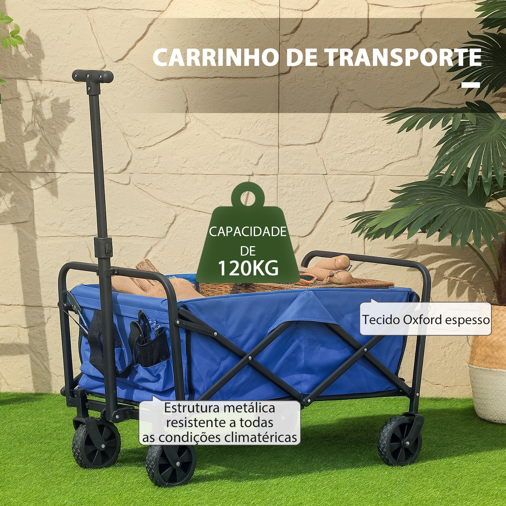 Carrinho de Transporte com Rodas Carrinho de Jardim Dobrável com Pega Telescópica Ajustável 2 Bolsas de Arrumação Carrinho de Praia Jardim Campismo Carga 120 kg 64x42x27 cm Azul