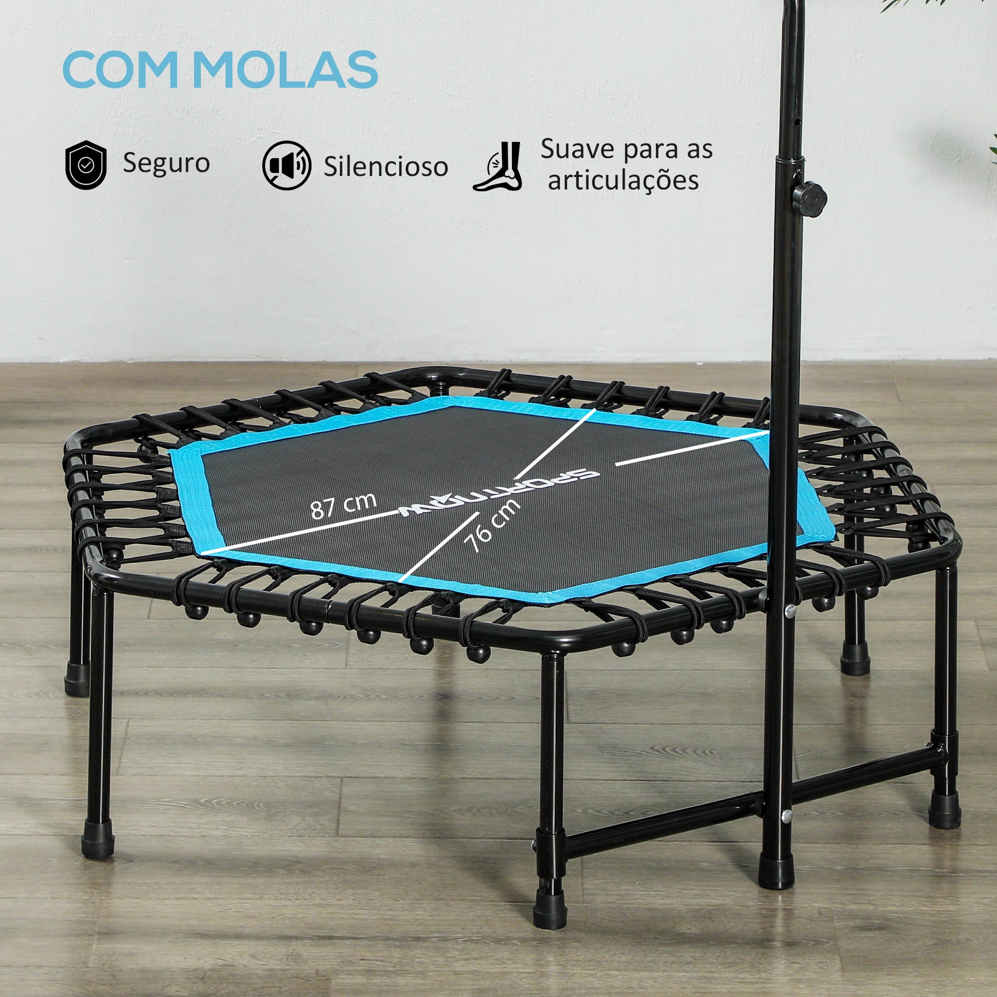 • Este trampolim de fitness tem uma barra em T ajustável em 3 níveis de altura, adaptando·se ao conforto de cada utilizador Possui um sistema de cordas elásticas que garante um treino silencioso e de baixo impacto, perfeito para cuidar das articulações Possui sete pontos de contacto que melhoram a estabilidade e a segurança, bem como almofadas antiderrapantes nas pernas para evitar movimentos indesejados É ideal para uma utilização prolongada, uma vez que a malha PP é fácil de limpar e muito durável A estrutura em aço e as pegas antiderrapantes proporcionam o apoio necessário para um treino seguro Perfeito para fortalecer os músculos, exercitar os braços, as pernas, a cintura, os glúteos e o abdómen Montagem necessária